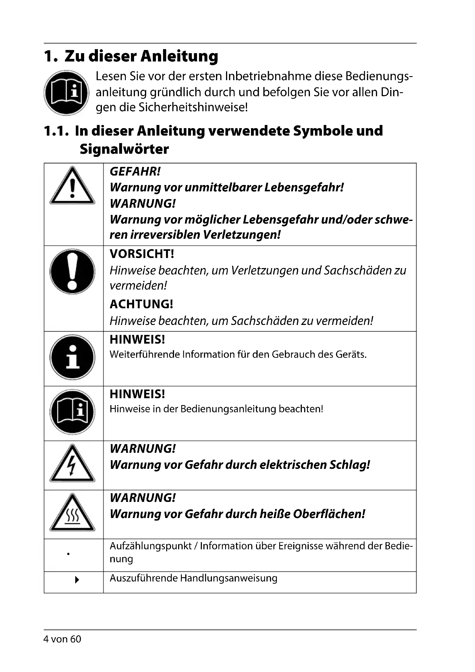 Lesen Sie vor der ersten Inbetriebnahme diese Bedienungs- anleitung gründlich durch und befolgen Sie vor allen Din- gen die Sicherheitshinweise! 1.1. In dieser Anleitung verwendete Symbole und Signalwörter GEFAHR! Warnung vor unmittelbarer Lebensgefahr! WARNUNG! Warnung vor möglicher Lebensgefahr und/oder schwe- ren irreversiblen Verletzungen! VORSICHT! Hinweise beachten, um Verletzungen und Sachschäden zu vermeiden! ACHTUNG! Hinweise beachten, um Sachschäden zu vermeiden! HINWEIS! Weiterführende Information für den Gebrauch des Geräts. HINWEIS! Hinweise in der Bedienungsanleitung beachten! WARNUNG! Warnung vor Gefahr durch elektrischen Schlag! WARNUNG! Warnung vor Gefahr durch heiße Oberflächen!