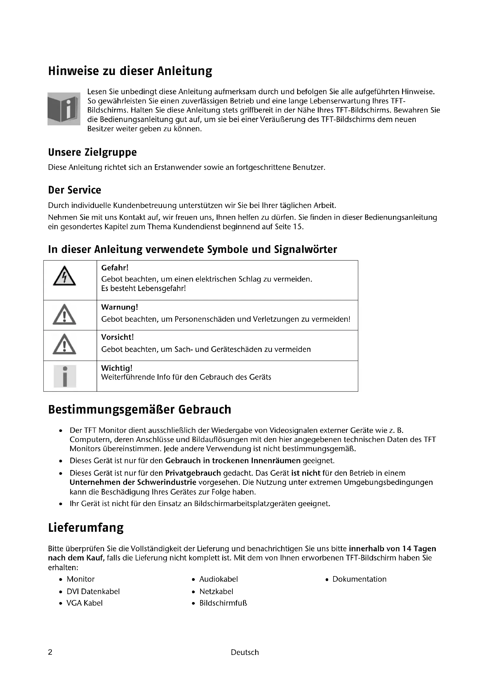 Hinweise zu dieser Anleitung Lesen Sie unbedingt diese Anleitung aufmerksam durch und befolgen Sie alle aufgeführten Hinweise. So gewährleisten Sie einen zuverlässigen Betrieb und eine lange Lebenserwartung Ihres TFT- Bildschirms. Halten Sie diese Anleitung stets griffbereit in der Nähe Ihres TFT-Bildschirms. Bewahren Sie die Bedienungsanleitung gut auf, um sie bei einer Veräußerung des TFT-Bildschirms dem neuen Besitzer weiter geben zu können. Unsere Zielgruppe Diese Anleitung richtet sich an Erstanwender sowie an fortgeschrittene Benutzer. Der Service Durch individuelle Kundenbetreuung unterstützen wir Sie bei Ihrer täglichen Arbeit. Nehmen Sie mit uns Kontakt auf, wir freuen uns, Ihnen helfen zu dürfen. Sie finden in dieser Bedienungsanleitung ein gesondertes Kapitel zum Thema Kundendienst beginnend auf Seite 15. In dieser Anleitung verwendete Symbole und Signalwörter Gefahr! Gebot beachten, um einen elektrischen Schlag zu vermeiden. Es besteht Lebensgefahr! Warnung! Gebot beachten, um Personenschäden und Verletzungen zu vermeiden! Vorsicht! Gebot beachten, um Sach- und Geräteschäden zu vermeiden Wichtig! Weiterführende Info für den Gebrauch des Geräts Bestimmungsgemäßer Gebrauch Der TFT Monitor dient ausschließlich der Wiedergabe von Videosignalen externer Geräte wie z. B. Computern, deren Anschlüsse und Bildauflösungen mit den hier angegebenen technischen Daten des TFT Monitors übereinstimmen. Jede andere Verwendung ist nicht bestimmungsgemäß. Dieses Gerät ist nur für den Gebrauch in trockenen Innenräumen geeignet. Dieses Gerät ist nur für den Privatgebrauch gedacht. Das Gerät ist nicht für den Betrieb in einem Unternehmen der Schwerindustrie vorgesehen. Die Nutzung unter extremen Umgebungsbedingungen kann die Beschädigung Ihres Gerätes zur Folge haben. Ihr Gerät ist nicht für den Einsatz an Bildschirmarbeitsplatzgeräten geeignet. Lieferumfang Bitte überprüfen Sie die Vollständigkeit der Lieferung und benachrichtigen Sie uns bitte innerhalb von 14 Tagen nach dem Kauf, falls die Lieferung nicht komplett ist. Mit dem von Ihnen erworbenen TFT-Bildschirm haben Sie erhalten: Monitor DVI Datenkabel VGA Kabel Audiokabel Netzkabel Bildschirmfuß