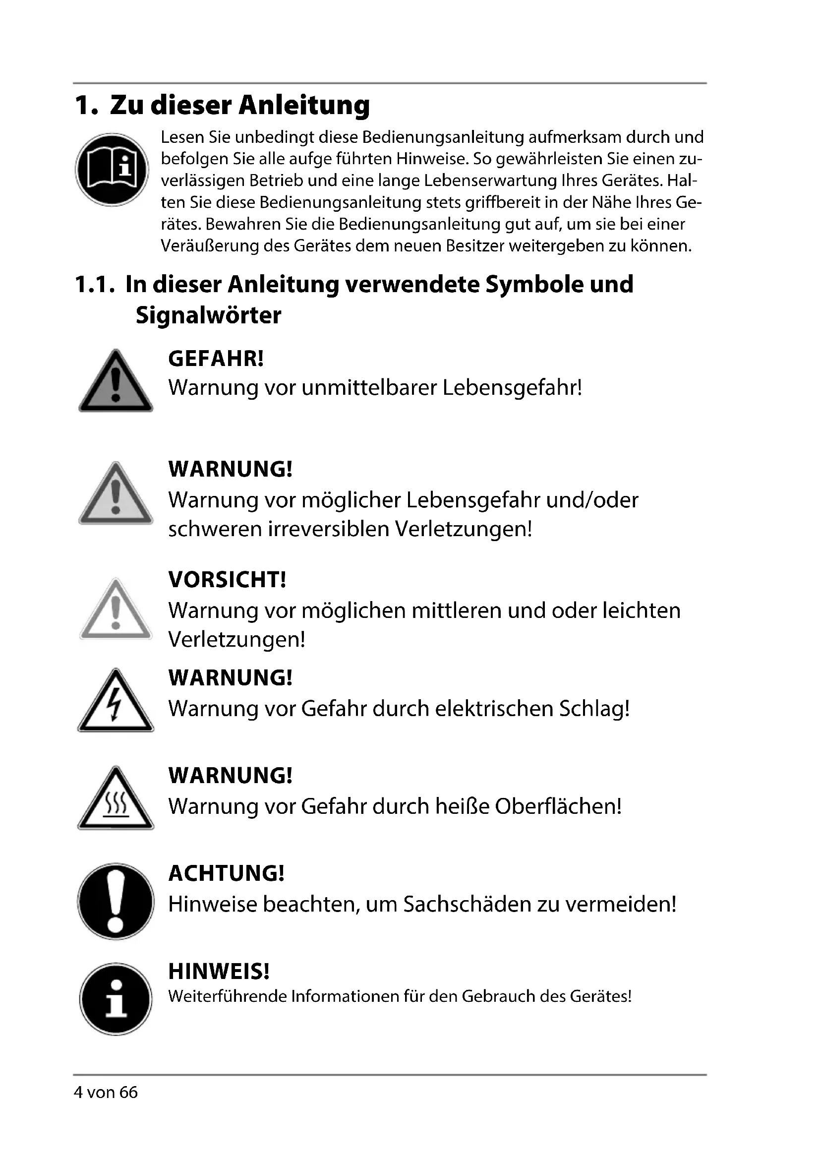Lesen Sie unbedingt diese Bedienungsanleitung aufmerksam durch und befolgen Sie alle aufge führten Hinweise. So gewährleisten Sie einen zu- verlässigen Betrieb und eine lange Lebenserwartung Ihres Gerätes. Hal- ten Sie diese Bedienungsanleitung stets griffbereit in der Nähe Ihres Ge- rätes. Bewahren Sie die Bedienungsanleitung gut auf, um sie bei einer Veräußerung des Gerätes dem neuen Besitzer weitergeben zu können. 1.1. In dieser Anleitung verwendete Symbole und Signalwörter GEFAHR! Warnung vor unmittelbarer Lebensgefahr! WARNUNG! Warnung vor möglicher Lebensgefahr und/oder schweren irreversiblen Verletzungen! VORSICHT! Warnung vor möglichen mittleren und oder leichten Verletzungen! WARNUNG! Warnung vor Gefahr durch elektrischen Schlag! WARNUNG! Warnung vor Gefahr durch heiße Oberflächen! ACHTUNG! Hinweise beachten, um Sachschäden zu vermeiden! HINWEIS! Weiterführende Informationen für den Gebrauch des Gerätes!DE