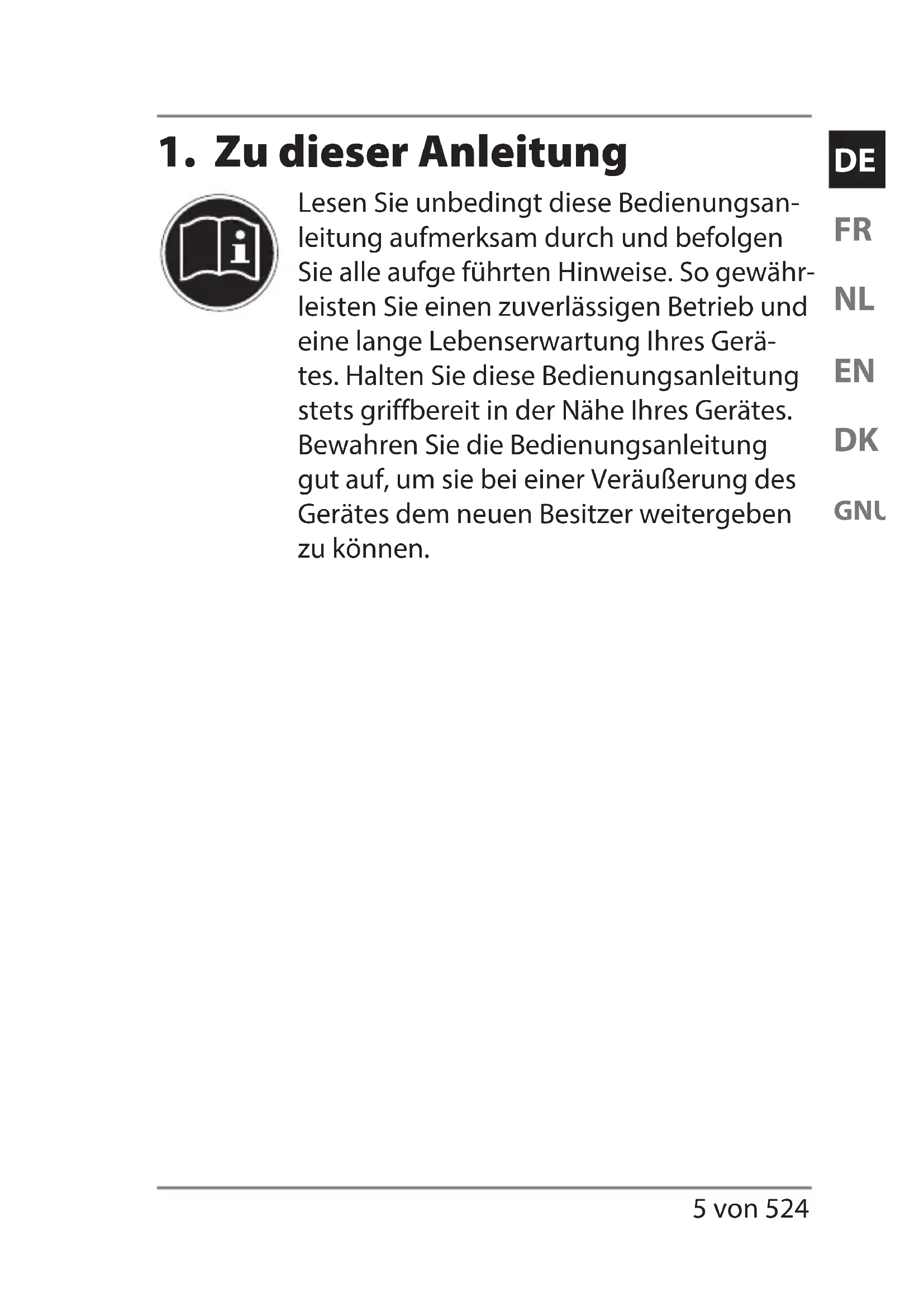 Lesen Sie unbedingt diese Bedienungsan- leitung aufmerksam durch und befolgen Sie alle aufge führten Hinweise. So gewähr- leisten Sie einen zuverlässigen Betrieb und eine lange Lebenserwartung Ihres Gerä- tes. Halten Sie diese Bedienungsanleitung stets griffbereit in der Nähe Ihres Gerätes. Bewahren Sie die Bedienungsanleitung gut auf, um sie bei einer Veräußerung des Gerätes dem neuen Besitzer weitergeben zu können. Ecom ML final REV2.indb 5Ecom ML final REV2.indb 5 07.03.2016 10:21:0907.03.2016 10:21:096 von 524 1.1. In dieser Anleitung verwendete Symbole und Signalwörter GEFAHR! Warnung vor unmittelbarer Lebensgefahr! WARNUNG! Warnung vor möglicher Le- bensgefahr und/oder schwe- ren irreversiblen Verletzun- gen! VORSICHT! Warnung vor möglichen mitt- leren und oder leichten Verlet- zungen! ACHTUNG! Hinweise beachten, um Sach- schäden zu vermeiden! HINWEIS! Weiterführende Informationen für den Gebrauch des Gerätes! Ecom ML final REV2.indb 6Ecom ML final REV2.indb 6 07.03.2016 10:21:0907.03.2016 10:21:097 von 524