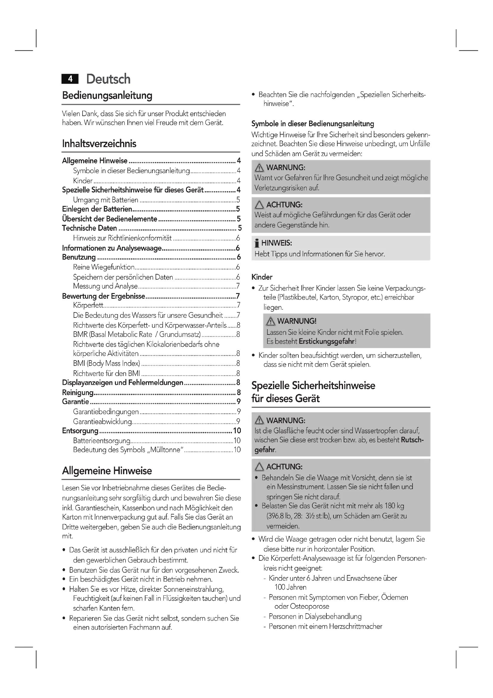 - Die Körperfett-Analysewaage ist für folgenden Personen- kreis nicht geeignet: - Kinder unter 6 Jahren und Erwachsene über 100 Jahren - Personen mit Symptomen von Fieber, Ödemen oder Osteoporose - Personen in Dialysebehandlung - Personen mit einem HerzschrittmacherDeutsch