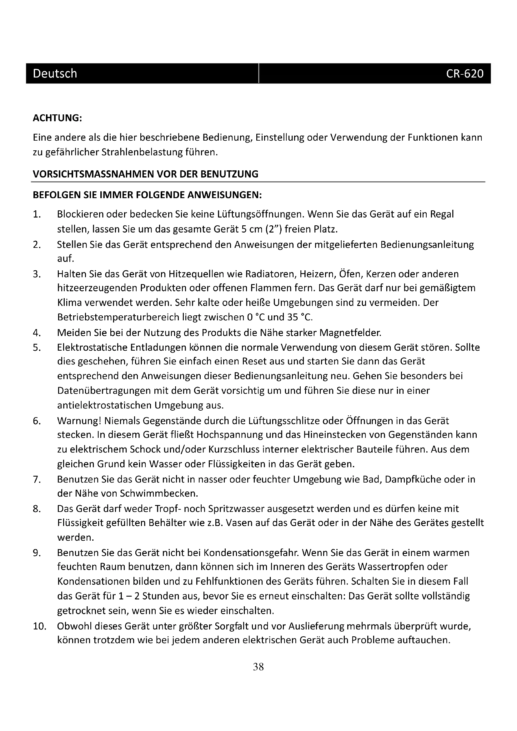 10. Obwohl dieses Gerät unter größter Sorgfalt und vor Auslieferung mehrmals überprüft wurde,