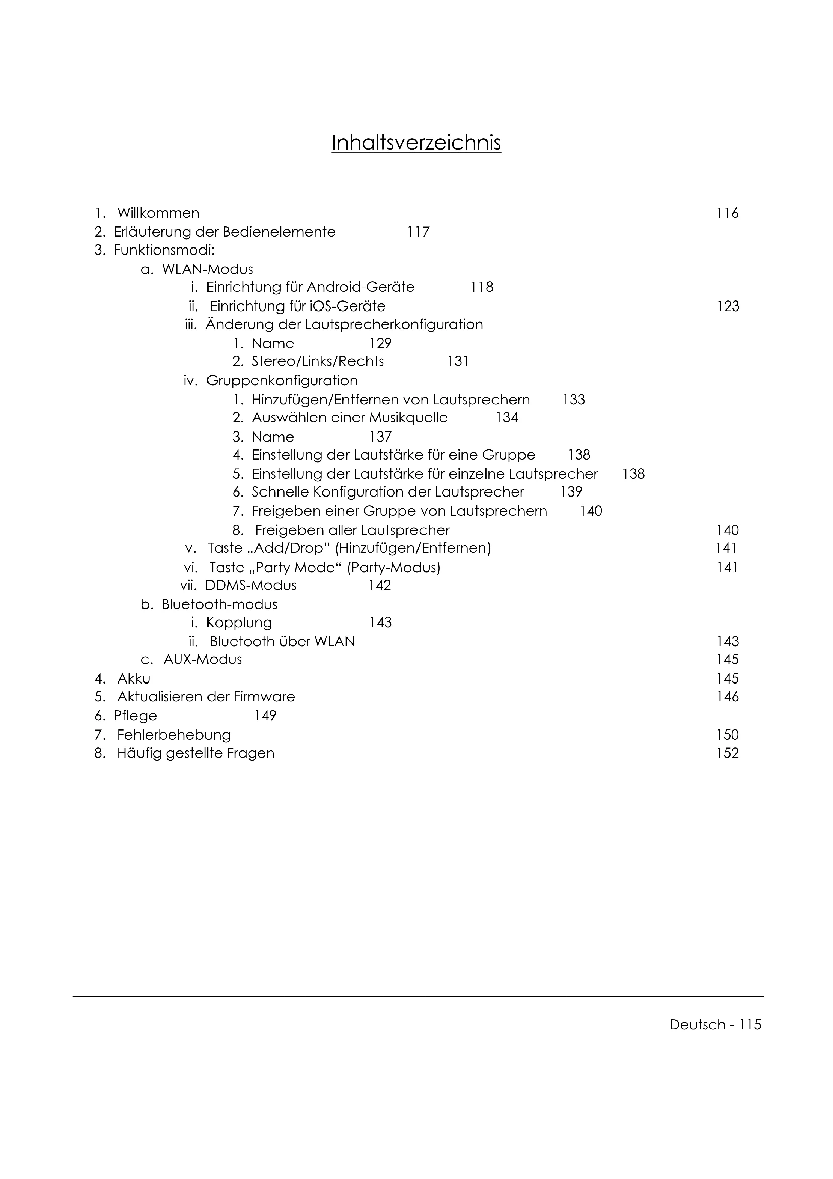 Hierzu drücken Sie 3 Sekunden lang gleichzeitig die Taste „SETUP“ und „PARTY MODE“. Daraufhin leuchtet die LED in Rot. Drücken Sie die Ein-/Austaste. Der Lautsprecher wurde nun auf die werkseitig festgelegten Standardeinstellungen zurückgesetzt. Wenn der Lautsprecher immer noch nicht reagiert, trennen Sie diesen von der Stromquelle (entweder Akku oder Netzadapter) und schließen Sie ihn dann wieder an die Stromquelle an.__________________________________________________________________________________________________ Deutsch - 152 Häufig gestellte Fragen