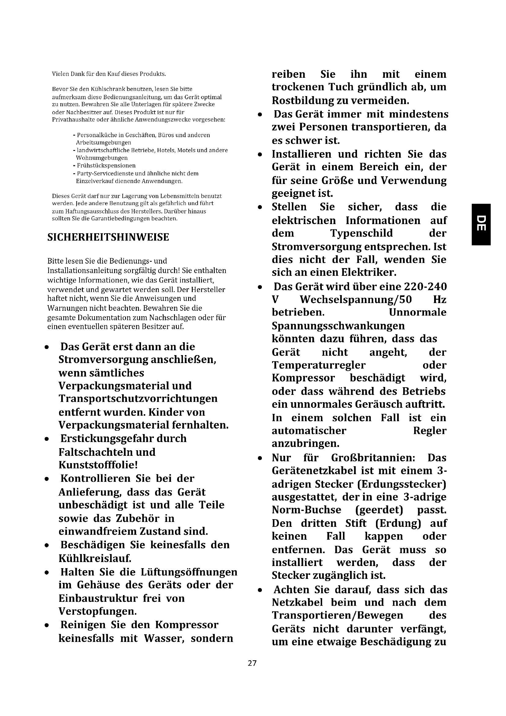 - Dieses Kühlgerät ist nicht für die Verwendung als Einbaugerät bestimmt DE33