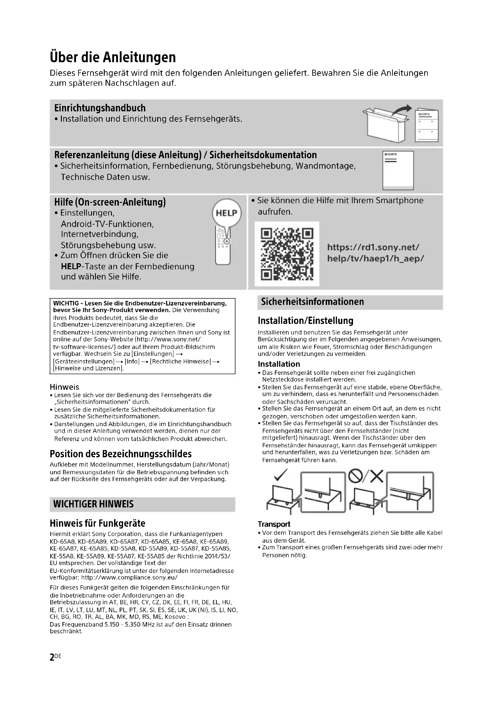 - Sie können die Hilfe mit Ihrem Smartphone aufrufen. https://rd1.sony.net/ help/tv/haep1/h_aep/ WICHTIG - Lesen Sie die Endbenutzer-Lizenzvereinbarung, bevor Sie Ihr Sony-Produkt verwenden. Die Verwendung Ihres Produkts bedeutet, dass Sie die Endbenutzer-Lizenzvereinbarung akzeptieren. Die Endbenutzer-Lizenzvereinbarung zwischen Ihnen und Sony ist online auf der Sony-Website (http://www.sony.net/tv-software-licenses/) oder auf Ihrem Produkt-Bildschirm verfügbar. Wechseln Sie zu [Einstellungen] t [Geräteeinstellungen] t [Info] t [Rechtliche Hinweise] t [Hinweise und Lizenzen].D:\_SONY TV\NC\SY20_NC_EU_RG_131\5014780131\05DE\5014780131_05DE.fm master page: Right KD-65A8 / 65A89 / 65A87 / 65A85 / 55A8 / 55A89 / 55A87 / 55A85 / KE-65A8 / 65A89 / 65A87 / 65A85 / 55A8 / 55A89 / 55A87 / 55A85 5-014-780-13(1)