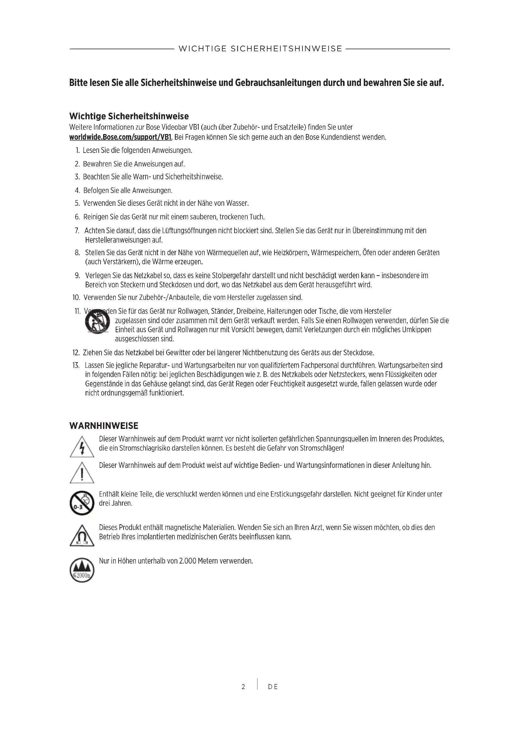 WICHTIGE SICHERHEITSHINWEISE Bitte lesen Sie alle Sicherheitshinweise und Gebrauchsanleitungen durch und bewahren Sie sie auf. Wichtige Sicherheitshinweise Weitere Informationen zur Bose VideobarVB1 (auch über Zubehör- und Ersatzteile) finden Sie unter worldwide.Bose.com/support/VB1. Bei Fragen können Sie sich gerne auch an den Bose Kundendienst wenden.
