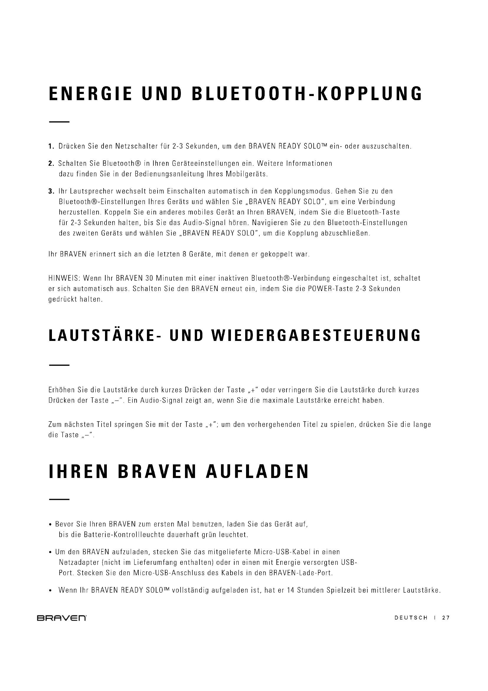 Bluetooth®-Einstellungen Ihres Geräts und wählen Sie „BRAVEN READY SOLO”, um eine Verbindung herzustellen. Koppeln Sie ein anderes mobiles Gerät an Ihren BRAVEN, indem Sie die Bluetooth-Taste für 2-3 Sekunden halten, bis Sie das Audio-Signal hören. Navigieren Sie zu den Bluetooth-Einstellungen des zweiten Geräts und wählen Sie „BRAVEN READY SOLO”, um die Kopplung abzuschließen. Ihr BRAVEN erinnert sich an die letzten 8 Geräte, mit denen er gekoppelt war. HINWEIS: Wenn Ihr BRAVEN 30 Minuten mit einer inaktiven Bluetooth®-Verbindung eingeschaltet ist, schaltet er sich automatisch aus. Schalten Sie den BRAVEN erneut ein, indem Sie die POWER-Taste 2-3 Sekunden gedrückt halten.