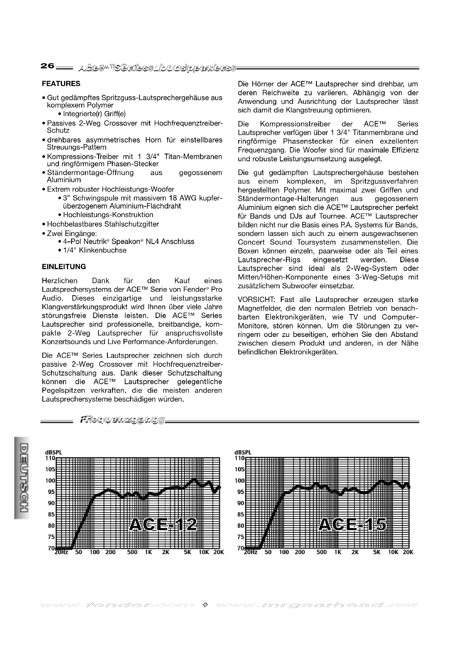 Pro Audio. Dieses einzigartige und leistungsstarke Klangverstärkungsprodukt wird Ihnen über viele Jahre störungsfreie Dienste leisten. Die ACE™ Series Lautsprecher sind professionelle, breitbandige, kom- pakte 2-Weg Lautsprecher für anspruchsvollste Konzertsounds und Live Performance-Anforderungen. Die ACE™ Series Lautsprecher zeichnen sich durch passive 2-Weg Crossover mit Hochfrequenztreiber- Schutzschaltung aus. Dank dieser Schutzschaltung können die ACE™ Lautsprecher gelegentliche Pegelspitzen verkraften, die die meisten anderen Lautsprechersysteme beschädigen würden. Die Hörner der ACE™ Lautsprecher sind drehbar, um deren Reichweite zu variieren. Abhängig von der Anwendung und Ausrichtung der Lautsprecher lässt sich damit die Klangstreuung optimieren. Die Kompressionstreiber der ACE™ Series Lautsprecher verfügen über 1 3/4" Titanmembrane und ringförmige Phasenstecker für einen exzellenten Frequenzgang. Die Woofer sind für maximale Effizienz und robuste Leistungsumsetzung ausgelegt. Die gut gedämpften Lautsprechergehäuse bestehen aus einem komplexen, im Spritzgussverfahren hergestellten Polymer. Mit maximal zwei Griffen und Ständermontage-Halterungen aus gegossenem Aluminium eignen sich die ACE™ Lautsprecher perfekt für Bands und DJs auf Tournee. ACE™ Lautsprecher bilden nicht nur die Basis eines P.A. Systems für Bands, sondern lassen sich auch zu einem ausgewachsenen Concert Sound Toursystem zusammenstellen. Die Boxen können einzeln, paarweise oder als Teil eines Lautsprecher-Rigs eingesetzt werden. Diese Lautsprecher sind ideal als 2-Weg-System oder Mitten/Höhen-Komponente eines 3-Weg-Setups mit zusätzlichem Subwoofer einsetzbar. VORSICHT: Fast alle Lautsprecher erzeugen starke Magnetfelder, die den normalen Betrieb von benach- barten Elektronikgeräten, wie TV und Computer- Monitore, stören können. Um die Störungen zu ver- ringern oder zu beseitigen, erhöhen Sie den Abstand zwischen diesem Produkt und anderen, in der Nähe befindlichen Elektronikgeräten.