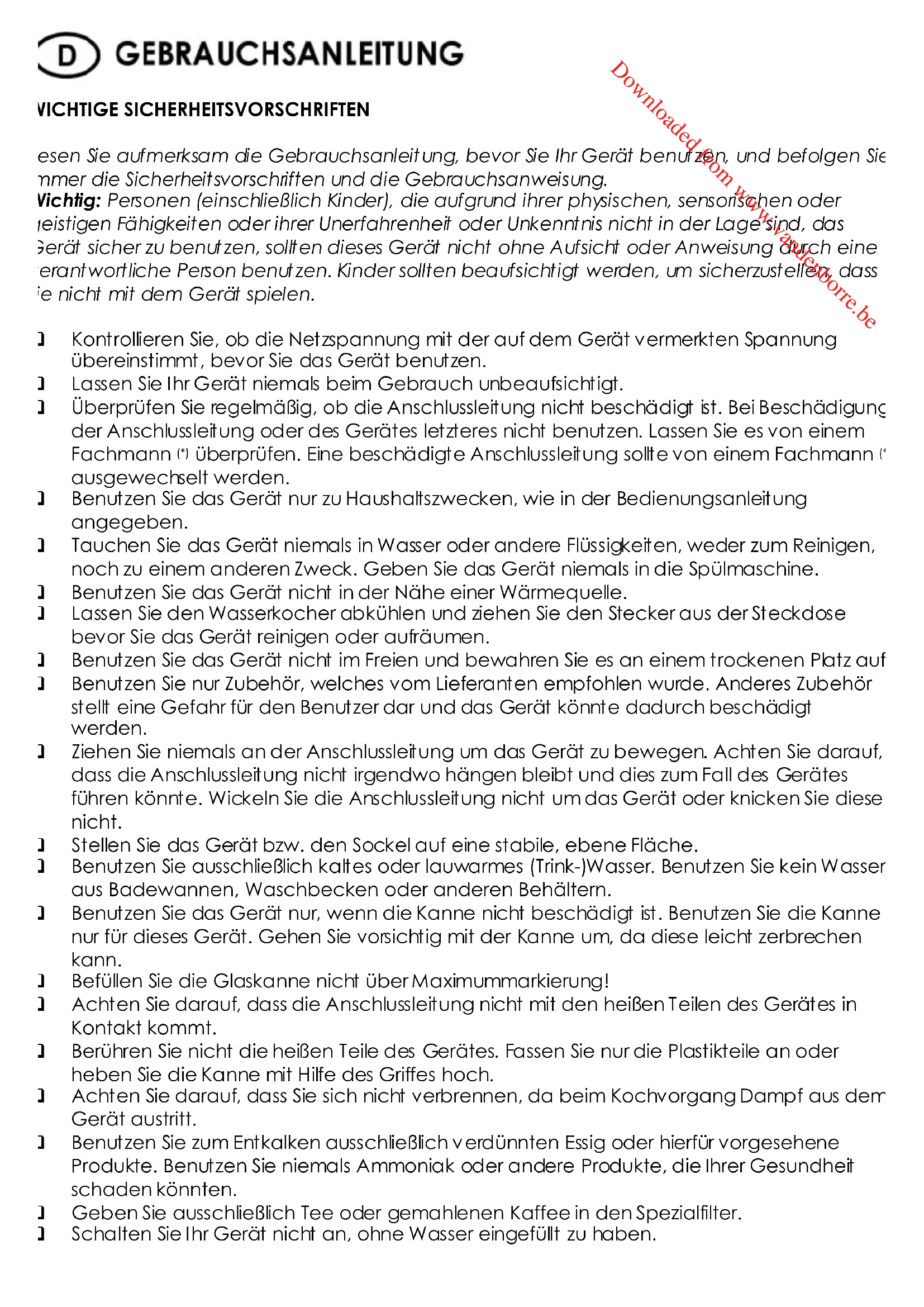 überprüfen. Eine beschädigte Anschlussleitung sollte von einem Fachmann ausgewechselt werden. Benutzen Sie das Gerät nur zu Haushaltszwecken, wie in der Bedienungsanleitung angegeben. Tauchen Sie das Gerät niemals in Wasser oder andere Flüssigkeiten, weder zum Reinigen, noch zu einem anderen Zweck. Geben Sie das Gerät niemals in die Spülmaschine. Benutzen Sie das Gerät nicht in der Nähe einer Wärmequelle. Lassen Sie den Wasserkocher abkühlen und ziehen Sie den Stecker aus der Steckdose bevor Sie das Gerät reinigen oder aufräumen. Benutzen Sie das Gerät nicht im Freien und bewahren Sie es an einem trockenen Platz auf. Benutzen Sie nur Zubehör, welches vom Lieferanten empfohlen wurde. Anderes Zubehör stellt eine Gefahr für den Benutzer dar und das Gerät könnte dadurch beschädigt werden. Ziehen Sie niemals an der Anschlussleitung um das Gerät zu bewegen. Achten Sie darauf, dass die Anschlussleitung nicht irgendwo hängen bleibt und dies zum Fall des Gerätes führen könnte. Wickeln Sie die Anschlussleitung nicht um das Gerät oder knicken Sie diese nicht. Stellen Sie das Gerät bzw. den Sockel auf eine stabile, ebene Fläche. Benutzen Sie ausschließlich kaltes oder lauwarmes (Trink-)Wasser. Benutzen Sie kein Wasser aus Badewannen, Waschbecken oder anderen Behältern. Benutzen Sie das Gerät nur, wenn die Kanne nicht beschädigt ist. Benutzen Sie die Kanne nur für dieses Gerät. Gehen Sie vorsichtig mit der Kanne um, da diese leicht zerbrechen kann. Befüllen Sie die Glaskanne nicht über Maximummarkierung! Achten Sie darauf, dass die Anschlussleitung nicht mit den heißen Teilen des Gerätes in Kontakt kommt. Berühren Sie nicht die heißen Teile des Gerätes. Fassen Sie nur die Plastikteile an oder heben Sie die Kanne mit Hilfe des Griffes hoch. Achten Sie darauf, dass Sie sich nicht verbrennen, da beim Kochvorgang Dampf aus dem Gerät austritt. Benutzen Sie zum Entkalken ausschließlich verdünnten Essig oder hierfür vorgesehene Produkte. Benutzen Sie niemals Ammoniak oder andere Produkte, die Ihrer Gesundheit schaden könnten. Geben Sie ausschließlich Tee oder gemahlenen Kaffee in den Spezialfilter. Schalten Sie Ihr Gerät nicht an, ohne Wasser eingefüllt zu haben. Downloaded from www.vandenborre.be Copies of the I/B. Please reproduce them without any changes except under special instruction from Team International BELGIUM. The pages must be reproduced and folded in order to obtain a booklet A5 (+/- 148.5 mm width x 210 mm height). When folding, make sure you keep the good numbering when you turn the pages of the I/B. Don’t change the page numbering. Keep the language integrity. 5 TKG TKB 1023 Assembly page 5/20 Fax +32 2 359 95 50 Achten Sie darauf, dass der Deckel gut aufliegt. Heben Sie nur dann den Deckel hoch, wenn der Kochvorgang beendet ist. Achten Sie darauf, dass Ihr Gerät nicht zu sehr gefüllt ist, da sonst kochendes Wasser entweichen könnte. Verletzungsgefahr! Fachmann: anerkannter Kundendienst des Lieferanten oder des Importeurs, der für derartige Reparaturen zuständig ist. Für eventuelle Reparaturen wenden Sie sich bitte an diesen Kundendienst.