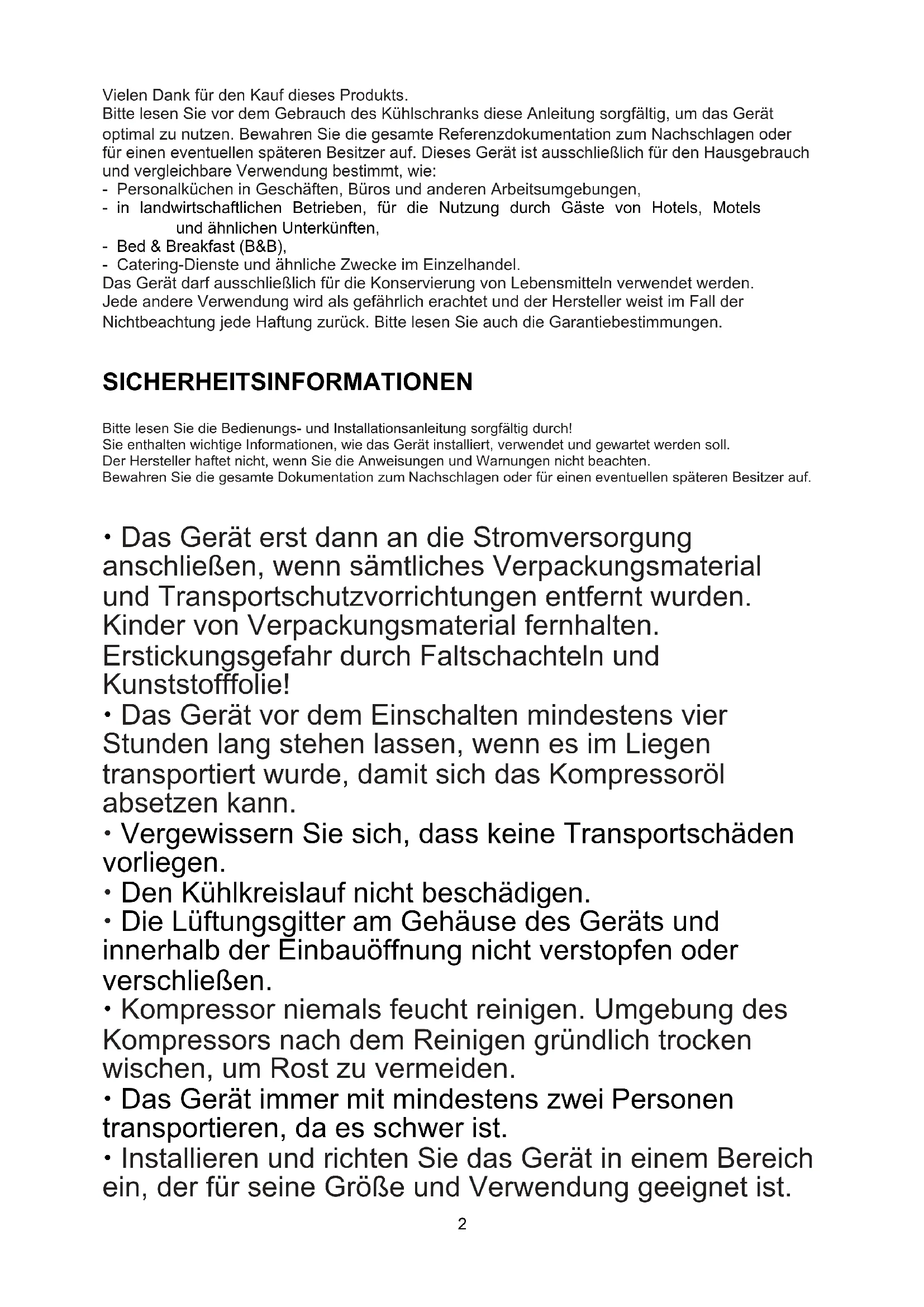 Vielen Dank für den Kauf dieses Produkts. Bitte lesen Sie vor dem Gebrauch des Kühlschranks diese Anleitung sorgfältig, um das Gerät optimal zu nutzen. Bewahren Sie die gesamte Referenzdokumentation zum Nachschlagen oder für einen eventuellen späteren Besitzer auf. Dieses Gerät ist ausschließlich für den Hausgebrauch und vergleichbare Verwendung bestimmt, wie: - Personalküchen in Geschäften, Büros und anderen Arbeitsumgebungen, - in landwirtschaftlichen Betrieben, für die Nutzung durch Gäste von Hotels, Motels und ähnlichen Unterkünften, - Bed & Breakfast (B&B), - Catering-Dienste und ähnliche Zwecke im Einzelhandel. Das Gerät darf ausschließlich für die Konservierung von Lebensmitteln verwendet werden. Jede andere Verwendung wird als gefährlich erachtet und der Hersteller weist im Fall der Nichtbeachtung jede Haftung zurück. Bitte lesen Sie auch die Garantiebestimmungen. SICHERHEITSINFORMATIONEN Bitte lesen Sie die Bedienungs- und Installationsanleitung sorgfältig durch! Sie enthalten wichtige Informationen, wie das Gerät installiert, verwendet und gewartet werden soll. Der Hersteller haftet nicht, wenn Sie die Anweisungen und Warnungen nicht beachten. Bewahren Sie die gesamte Dokumentation zum Nachschlagen oder für einen eventuellen späteren Besitzer auf. Das Gerät erst dann an die Stromversorgung anschließen, wenn sämtliches Verpackungsmaterial und Transportschutzvorrichtungen entfernt wurden. Kinder von Verpackungsmaterial fernhalten. Erstickungsgefahr durch Faltschachteln und Kunststofffolie! Das Gerät vor dem Einschalten mindestens vier Stunden lang stehen lassen, wenn es im Liegen transportiert wurde, damit sich das Kompressoröl absetzen kann. Vergewissern Sie sich, dass keine Transportschäden vorliegen. Den Kühlkreislauf nicht beschädigen. Die Lüftungsgitter am Gehäuse des Geräts und innerhalb der Einbauöffnung nicht verstopfen oder verschließen. Kompressor niemals feucht reinigen. Umgebung des Kompressors nach dem Reinigen gründlich trocken wischen, um Rost zu vermeiden. Das Gerät immer mit mindestens zwei Personen transportieren, da es schwer ist. Installieren und richten Sie das Gerät in einem Bereich ein, der für seine Größe und Verwendung geeignet ist.3 Nur für Großbritannien: Das Gerätenetzkabel ist mit einem 3-adrigen Stecker (Erdungsstecker) ausgestattet, der in eine 3-adrige Norm-Buchse (geerdet) passt. Den dritten Stift (Erdung) auf keinen Fall kappen oder entfernen. Das Gerät muss so installiert werden, dass der Stecker erreichbar ist. Darauf achten, dass das Stromkabel während und nach dem Tragen/Verschieben des Geräts nicht darunter stecken bleibt, damit es nicht beschädigt oder zerschnitten wird. Wenn das Stromkabel beschädigt ist, muss es vom Hersteller oder von seinem Service- Mitarbeiter, oder einer gleichwertig qualifizierten Person ausgetauscht werden, um jegliches Risiko zu vermeiden. Das Gerät nicht in Umgebungen mit feuchter, öliger oder staubiger Atmosphäre installieren sowie vor direkter Sonneneinstrahlung und Wasser schützen. Das Gerät nicht in der Nähe von Hitzequellen oder entflammbaren Materialien installieren. FÜR Geräte mit Gefrierfach: Bei Stromausfall nicht die Türe öffnen. Das Gefriergut sollte nicht beeinträchtigt werden, wenn der Stromausfall die auf dem Typenschild angegebenen Stunden (Temperaturanstiegszeit) nicht überdauert. Dauert der Stromausfall länger, sollten die Lebensmittel überprüft und sofort verzehrt oder gekocht und erneut eingefroren werden. Lässt sich die Klappe des Geräts schwierig öffnen, nachdem Sie diese gerade geschlossen haben, so ist dies normal. Dies liegt am Druckausgleich, der hergestellt wird. Die Klappe lässt sich normalerweise nach wenigen Minuten wieder öffnen. Keine Arzneimittel, Bakterien oder Chemikalien im Gerät lagern. Dieses Gerät ist ein Haushaltsgerät, es wird daher davon abgeraten, Materialien zu lagern, die extreme Temperaturen erfordern. Stellen Sie sicher, dass die elektrischen Informationen auf dem Typenschild der Stromversorgung entsprechen. Ist dies nicht der Fall, wenden Sie sich an einen Elektriker.4 Das Netzkabel nicht stark spannen oder biegen und den Netzstecker nicht mit nassen Händen berühren. Bewahren Sie keine Produkte auf, die entzündliche Treibmittel (z. B. Sprühdosen) oder explosive Substanzen enthalten. Explosionsgefahr! Stellen Sie keine instabilen Gegenstände (schwere Gegenstände, mit Wasser gefüllte Behälter) auf den Kühlschrank, um Verletzungen durch Herunterfallen oder elektrische Schläge durch Kontakt mit Wasser zu vermeiden. Im Inneren des Kühlschranks keine elektrischen Geräte benutzen, es sei denn, der Typ wurde vom Hersteller empfohlen. Berühren Sie interne Kühlelemente nicht, insbesondere nicht mit nassen Händen, um Risse oder Verletzungen zu vermeiden. Gefährdet sind hier Kinder, Menschen mit eingeschränkten körperlichen, geistigen oder sensorischen Fähigkeiten sowie Menschen, die über unzureichende Kenntnisse in Bezug auf den sicheren Betrieb des Geräts verfügen. Stellen Sie sicher, dass Kinder und schutzbedürftige Menschen die Gefahren verstanden haben. Eine für die Sicherheit verantwortliche Person muss Kinder und gefährdete Personen, die das Gerät benutzen, überwachen oder instruieren. Nur Kinder ab 8 Jahren dürfen das Gerät benutzen. Dieses Gerät ist kein Spielzeug für Kinder. Kinder im Alter von 3 bis 8 Jahren dürfen Lebensmittel in dieses Gerät legen und herausnehmen. FÜR Geräte mit Gefrierfach: Keine abgefüllten oder konservierten Flüssigkeiten (insbesondere kohlensäurehaltige Getränke) im Gefrierfach aufbewahren. Flaschen und Dosen können platzen! FÜR Geräte mit Gefrierfach: Tiefkühlware nie direkt aus dem Gefrierfach in den Mund nehmen. Es besteht die Gefahr einer Kälteverbrennung!5 Halten Sie Kunststoffteile und die Türdichtung frei von Öl und Fett. Andernfalls werden Kunststoffteile und die Türdichtung porös. Vor jedem Eingriff am Gerät den N