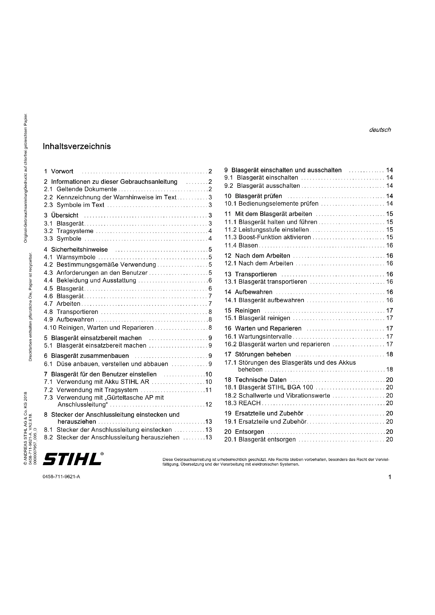 ANDREAS STIHL AG & Co. KG 18 Technische Daten 19 Ersatzteile und Zubehör Diese Symbole kennzeichnen original STIHL Ersatzteile und original STIHL Zubehör. 20 Entsorgen 21 EU-Konformitätserklärung0458-711-9621-A