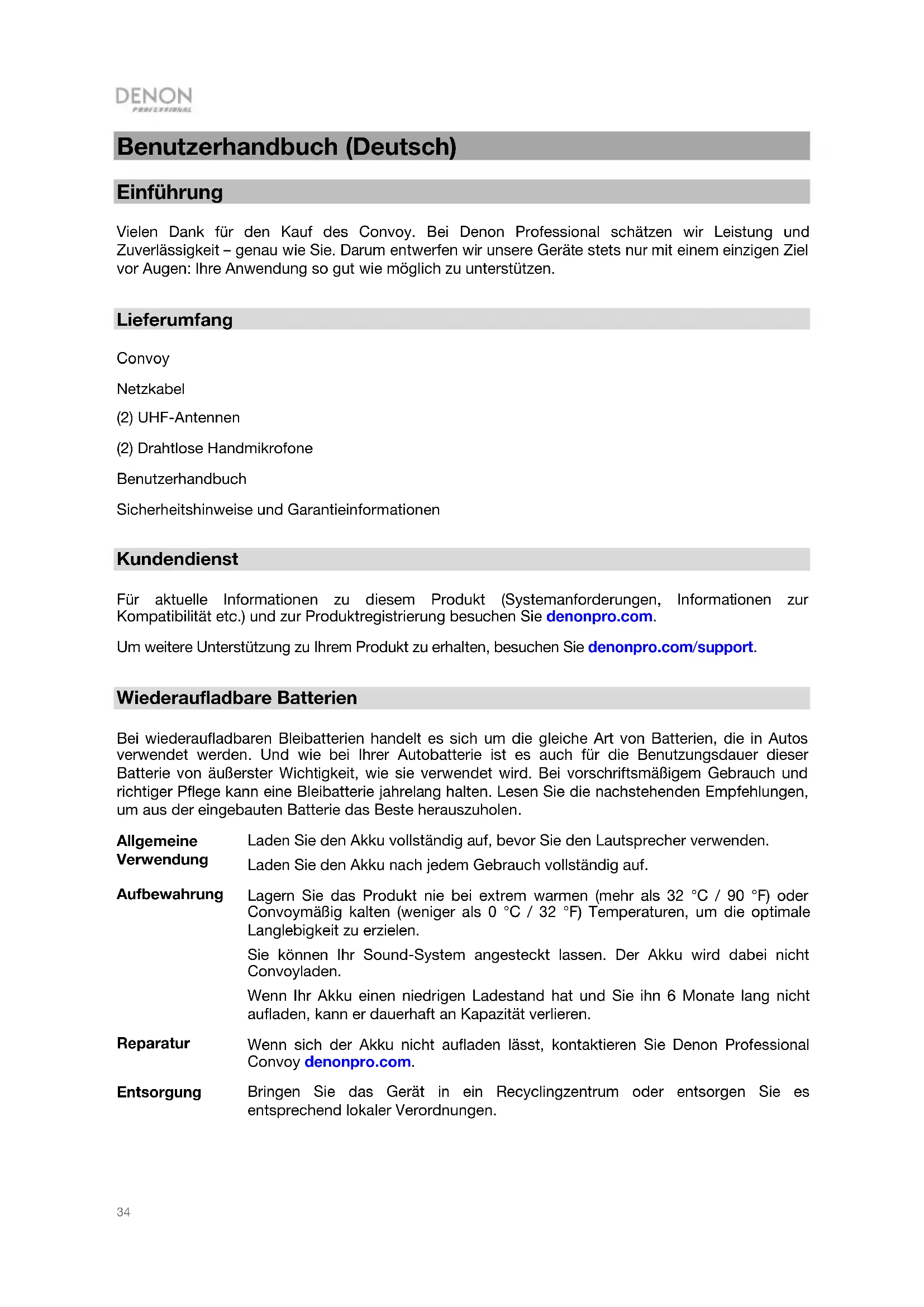 - Ripristinare la connessione Bluetooth sul vostro dispositivo audio spegnendo e riavviando il Bluetooth. Potete trovarlo nel menù Bluetooth delle Impostazioni del vostro telefono o di un altro dispositivo audio. Se ancora non funziona e avete già collegato Convoy in passato, cercate Convoy nella lista dei dispositivi disponibili o collegati in precedenza al Bluetooth del vostro dispositivo audio, cliccare sulla “ruota” o sull’icona a “i” situata accanto e selezionare Scollega o Dimentica. Spegnere e riaccendere Convoy, poi provare ad allinearlo nuovamente una volta ricomparso nella lista dei dispositivi disponibili. Nota bene: se Convoy è stato allineato da poco ad un altro dispositivo audio che si trova nelle vicinanze, è possibile ripetere il procedimento con quel dispositivo audio per scollegarlo completamente.34 Benutzerhandbuch (Deutsch) Einführung Vielen Dank für den Kauf des Convoy. Bei Denon Professional schätzen wir Leistung und Zuverlässigkeit – genau wie Sie. Darum entwerfen wir unsere Geräte stets nur mit einem einzigen Ziel vor Augen: Ihre Anwendung so gut wie möglich zu unterstützen. Lieferumfang Convoy Netzkabel (2) UHF-Antennen (2) Drahtlose Handmikrofone Benutzerhandbuch Sicherheitshinweise und Garantieinformationen Kundendienst Für aktuelle Informationen zu diesem Produkt (Systemanforderungen, Informationen zur Kompatibilität etc.) und zur Produktregistrierung besuchen Sie denonpro.com. Um weitere Unterstützung zu Ihrem Produkt zu erhalten, besuchen Sie denonpro.com/support. Wiederaufladbare Batterien Bei wiederaufladbaren Bleibatterien handelt es sich um die gleiche Art von Batterien, die in Autos verwendet werden. Und wie bei Ihrer Autobatterie ist es auch für die Benutzungsdauer dieser Batterie von äußerster Wichtigkeit, wie sie verwendet wird. Bei vorschriftsmäßigem Gebrauch und richtiger Pflege kann eine Bleibatterie jahrelang halten. Lesen Sie die nachstehenden Empfehlungen, um aus der eingebauten Batterie das Beste herauszuholen. Allgemeine Verwendung Laden Sie den Akku vollständig auf, bevor Sie den Lautsprecher verwenden. Laden Sie den Akku nach jedem Gebrauch vollständig auf. Aufbewahrung Lagern Sie das Produkt nie bei extrem warmen (mehr als 32 °C / 90 °F) oder Convoymäßig kalten (weniger als 0 °C / 32 °F) Temperaturen, um die optimale Langlebigkeit zu erzielen. Sie können Ihr Sound-System angesteckt lassen. Der Akku wird dabei nicht Convoyladen. Wenn Ihr Akku einen niedrigen Ladestand hat und Sie ihn 6 Monate lang nicht aufladen, kann er dauerhaft an Kapazität verlieren. Reparatur Wenn sich der Akku nicht aufladen lässt, kontaktieren Sie Denon Professional Convoy denonpro.com. Entsorgung Bringen Sie das Gerät in ein Recyclingzentrum oder entsorgen Sie es entsprechend lokaler Verordnungen.35 Wichtige Sicherheitshinweise Bitte beachten Sie: Denon Professional und inMusic sind weder für die Verwendung ihrer Produkte noch für den Missbrauch dieser Informationen für beliebige Zwecke verantwortlich. Denon Professional und inMusic sind nicht für die missbräuchliche Verwendung ihrer Produkte verantwortlich, die durch verabsäumte Inspektions- und Wartungsarbeiten verursacht wurde. Bitte beachten Sie auch das mitgelieferte Handbuch für Sicherheitshinweise und Garantieinformationen. Achtung: Um die Gefahr von Stromschlägen zu verringern, sollten Sie Convoy nicht an eine Steckdose anschließen, solange das Gitter entfernt ist. Schallpegel Eine Exposition gegenConvoy extrem hohen Lärmpegeln kann zu bleibenden Hörschäden führen. Die Occupational Safety and Health Administration (OSHA) der US-Regierung hat zulässige Expositionswerte für bestimmte Lärmpegel festgelegt. Laut OSHA können Belastungen durch Schalldruckpegel (SPL), die diese Grenzwerte Convoyschreiten, zu Hörverlust führen. Tragen Sie beim Einsatz von Geräten, die einen hohen Schalldruck erzeugen können, stets einen Gehörschutz. Stunden pro Tag SPL (dB) Beispiel 8 90 Kleines Konzert 6 92 Zug 4 95 U-Bahn 3 97 Leistungsstarke Desktop- Monitore 2 100 Konzert mit klassischer Musik 1,5 102 Nietmaschine 1 105 Maschinenfabrik 0,5 110 Flughafen 0,25 oder weniger 115 Rock-Konzert36