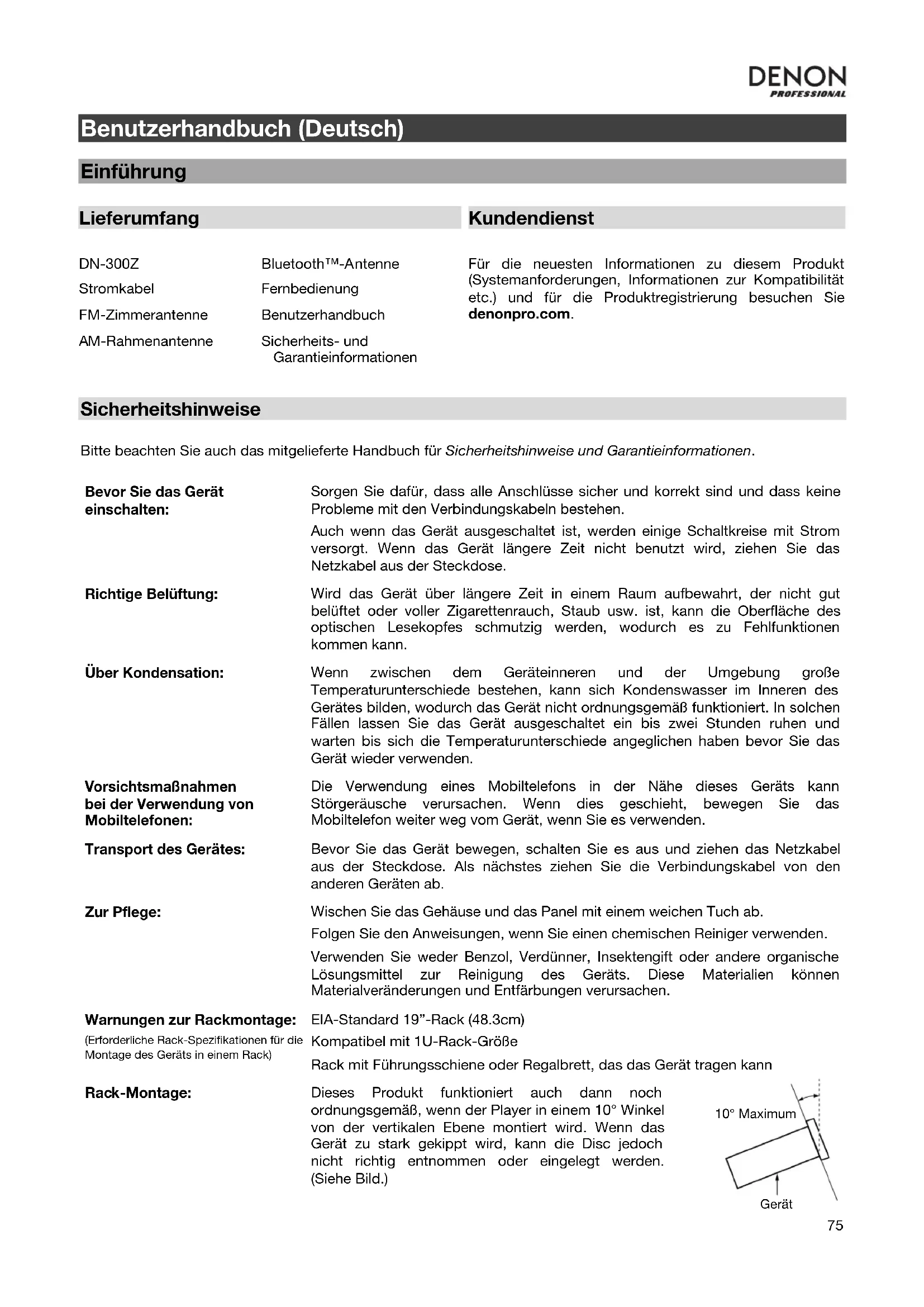 ntenne Fernbedienung Benutzerhandbuch Sicherheits- und Garantieinformationen Für die neuesten Informationen zu diesem Produkt (Systemanforderungen, Informationen zur Kompatibilität etc.) und für die Produktregistrierung besuchen Sie denonpro.com. Sicherheitshinweise Bitte beachten Sie auch das mitgelieferte Handbuch für Sicherheitshinweise und Garantieinformationen. Bevor Sie das Gerät einschalten: Sorgen Sie dafür, dass alle Anschlüsse sicher und korrekt sind und dass keine Probleme mit den Verbindungskabeln bestehen.
