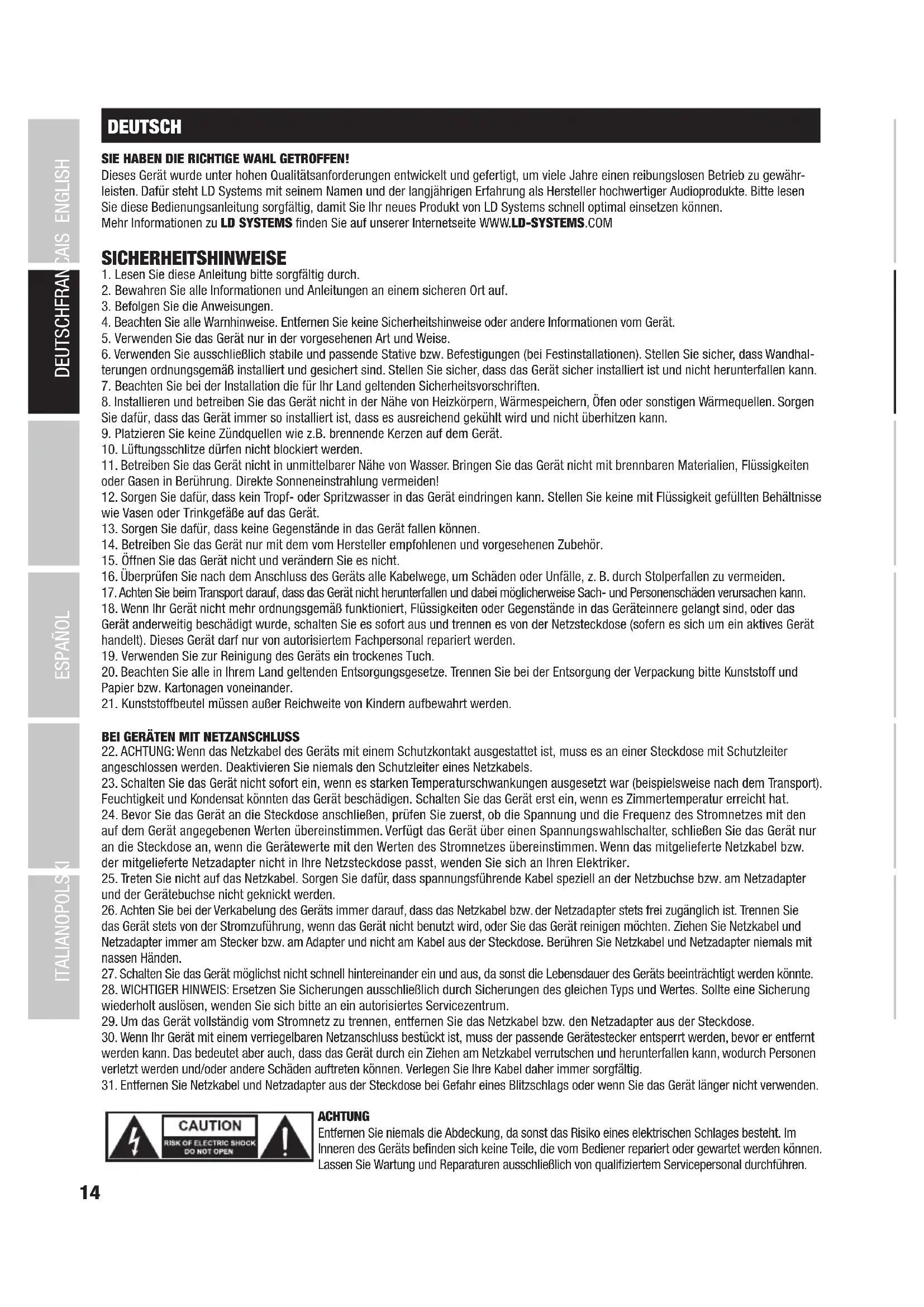 Dieses Gerat wudter hohen Qualitansforderungen entwickelt und gefertigt, um viel Jahre einen reibungslosen Betrieb zu gewahrleisten. Dafur steth LD Systems mit seinem Namen und der langjhrigen Erfahrung als Hersteller hochwertiger Audioproekte.itte lesen Sie diee Bedienungsanleitung sorgfaltig,damit Si hr neues Produrt von LD Systems schnll optimal einsetzen konnen.