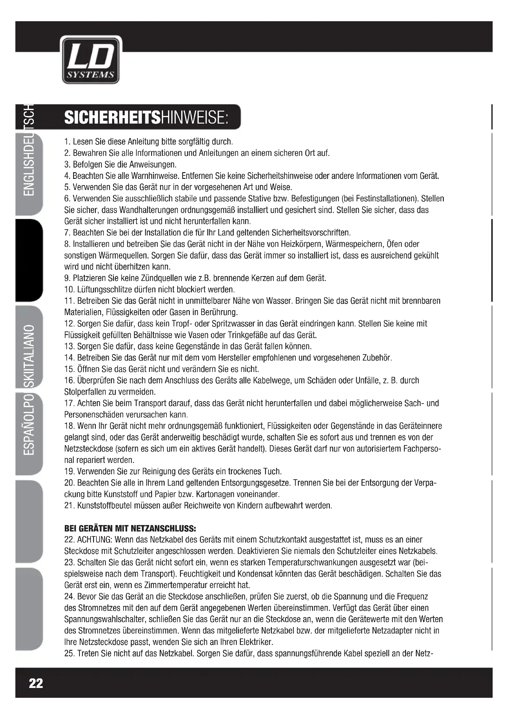 22. ACHTUNG: Wenn das Netzkabel des Geräts mit einem Schutzkontakt ausgestattet ist, muss es an einer