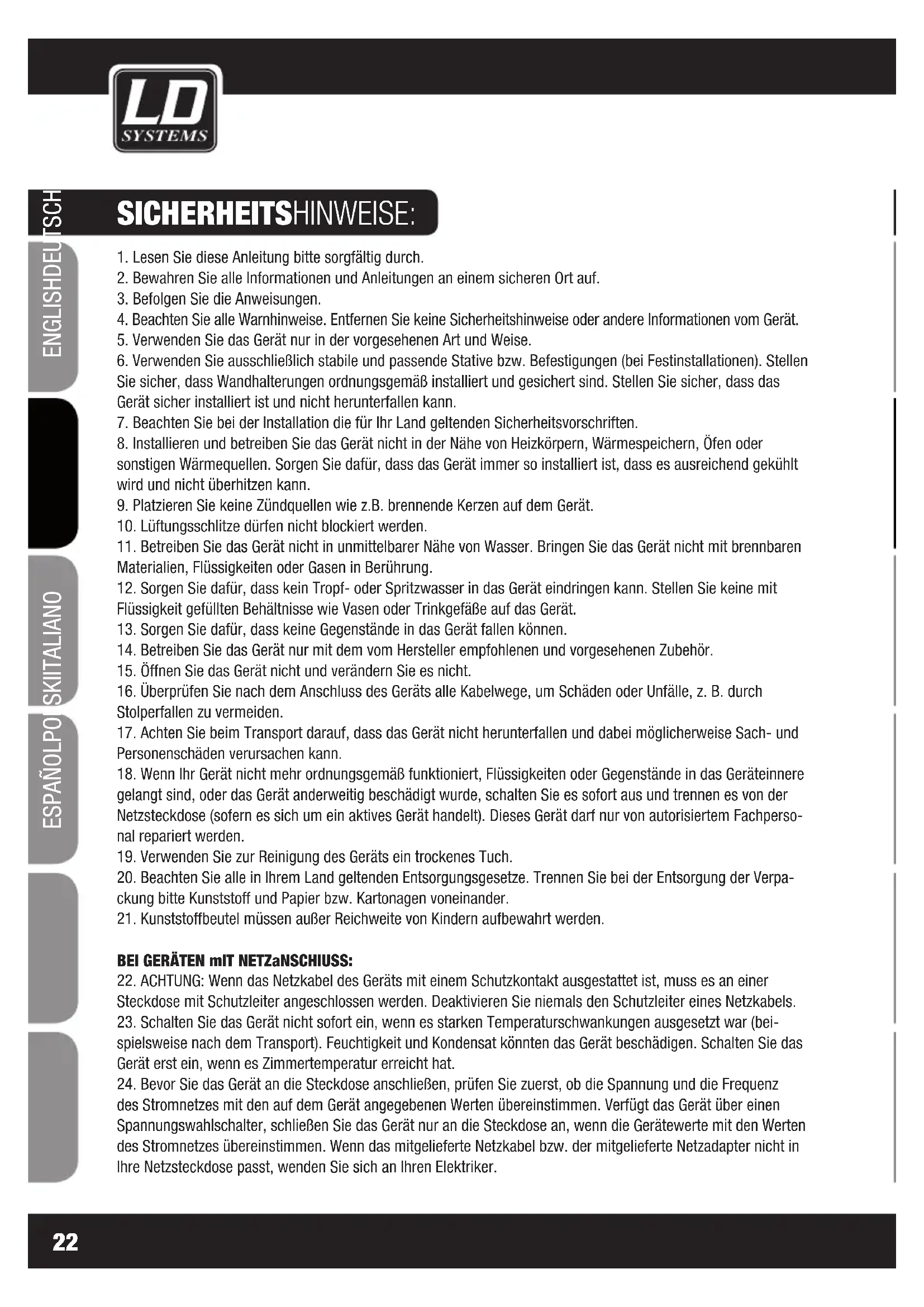 Dieses Gerät wurde unter hohen Qualitätsanforderungen entwickelt und gefertigt, um viele Jahre einen reibungs-losen Betrieb zu gewährleisten. Dafür steht LD Systems mit seinem Name und der langjährigen Erfahrung als Hersteller hochwertiger Audioprokte.