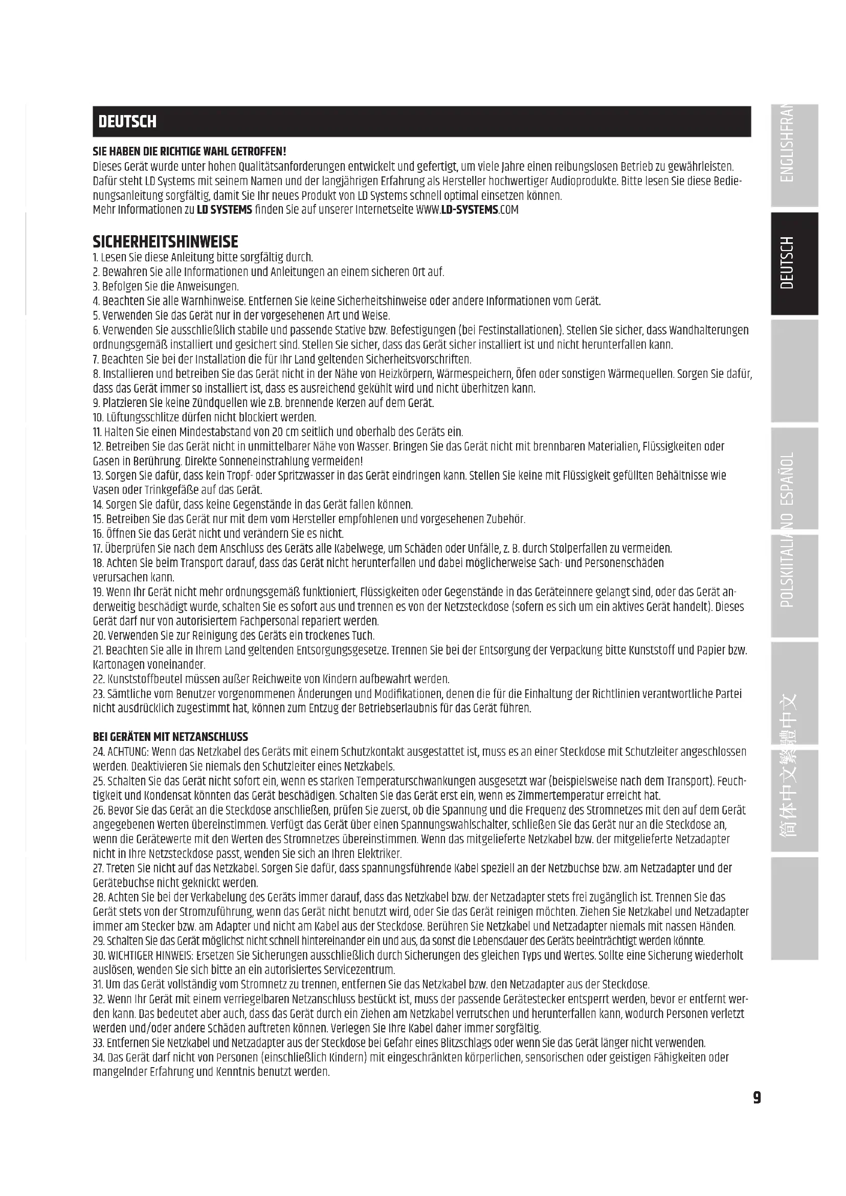 24. ACHTUNG: Wenn das Netzkabel des Geräts mit einem Schutzkontakt ausgestattet ist, muss es an einer Steckdose mit Schutzleiter angeschlossen werden. Deaktivieren Sie niemals den Schutzleiter eines Netzkabels. 25. Schalten Sie das Gerät nicht sofort ein, wenn es starken Temperaturschwankungen ausgesetzt war (beispielsweise nach dem Transport). Feuch- tigkeit und Kondensat könnten das Gerät beschädigen. Schalten Sie das Gerät erst ein, wenn es Zimmertemperatur erreicht hat. 26. Bevor Sie das Gerät an die Steckdose anschließen, prüfen Sie zuerst, ob die Spannung und die Frequenz des Stromnetzes mit den auf dem Gerät angegebenen Werten übereinstimmen. Verfügt das Gerät über einen Spannungswahlschalter, schließen Sie das Gerät nur an die Steckdose an, wenn die Gerätewerte mit den Werten des Stromnetzes übereinstimmen. Wenn das mitgelieferte Netzkabel bzw. der mitgelieferte Netzadapter nicht in Ihre Netzsteckdose passt, wenden Sie sich an Ihren Elektriker. 27. Treten Sie nicht auf das Netzkabel. Sorgen Sie dafür, dass spannungsführende Kabel speziell an der Netzbuchse bzw. am Netzadapter und der Gerätebuchse nicht geknickt werden. 28. Achten Sie bei der Verkabelung des Geräts immer darauf, dass das Netzkabel bzw. der Netzadapter stets frei zugänglich ist. Trennen Sie das Gerät stets von der Stromzuführung, wenn das Gerät nicht benutzt wird, oder Sie das Gerät reinigen möchten. Ziehen Sie Netzkabel und Netzadapter immer am Stecker bzw. am Adapter und nicht am Kabel aus der Steckdose. Berühren Sie Netzkabel und Netzadapter niemals mit nassen Händen. 29. Schalten Sie das Gerät möglichst nicht schnell hintereinander ein und aus, da sonst die Lebensdauer des Geräts beeinträchtigt werden könnte. 30. WICHTIGER HINWEIS: Ersetzen Sie Sicherungen ausschließlich durch Sicherungen des gleichen Typs und Wertes. Sollte eine Sicherung wiederholt auslösen, wenden Sie sich bitte an ein autorisiertes Servicezentrum. 31. Um das Gerät vollständig vom Stromnetz zu trennen, entfernen Sie das Netzkabel bzw. den Netzadapter aus der Steckdose. 32. Wenn Ihr Gerät mit einem verriegelbaren Netzanschluss bestückt ist, muss der passende Gerätestecker entsperrt werden, bevor er entfernt wer- den kann. Das bedeutet aber auch, dass das Gerät durch ein Ziehen am Netzkabel verrutschen und herunterfallen kann, wodurch Personen verletzt werden und/oder andere Schäden auftreten können. Verlegen Sie Ihre Kabel daher immer sorgfältig. 33. Entfernen Sie Netzkabel und Netzadapter aus der Steckdose bei Gefahr eines Blitzschlags oder wenn Sie das Gerät länger nicht verwenden. 34. Das Gerät darf nicht von Personen (einschließlich Kindern) mit eingeschränkten körperlichen, sensorischen oder geistigen Fähigkeiten oder mangelnder Erfahrung und Kenntnis benutzt werden.10 DEUTSCHENGLISH FRANCAIS ESPAÑOL POLSKI ITALIANO