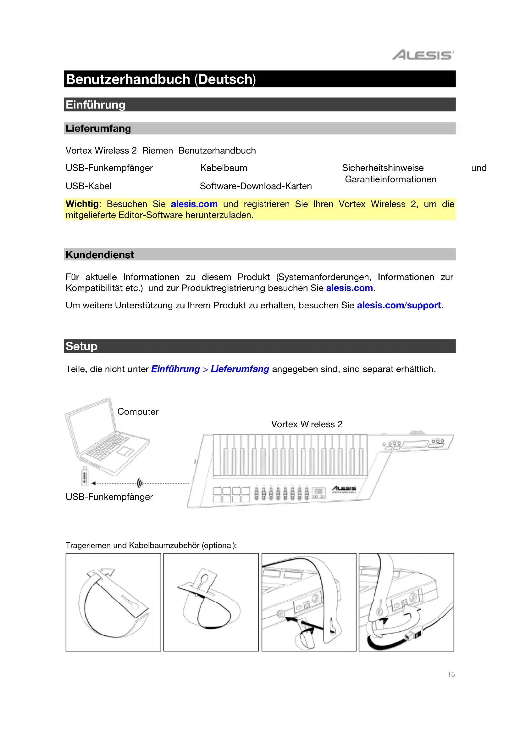 Benutzerhandbuch (Deutsch) Einführung Lieferumfang Vortex Wireless 2 Riemen Benutzerhandbuch USB-Funkempfänger Kabelbaum Sicherheitshinweise und Garantieinformationen USB-Kabel Software-Download-Karten Wichtig: Besuchen Sie alesis.com und registrieren Sie Ihren Vortex Wireless 2, um die mitgelieferte Editor-Software herunterzuladen.