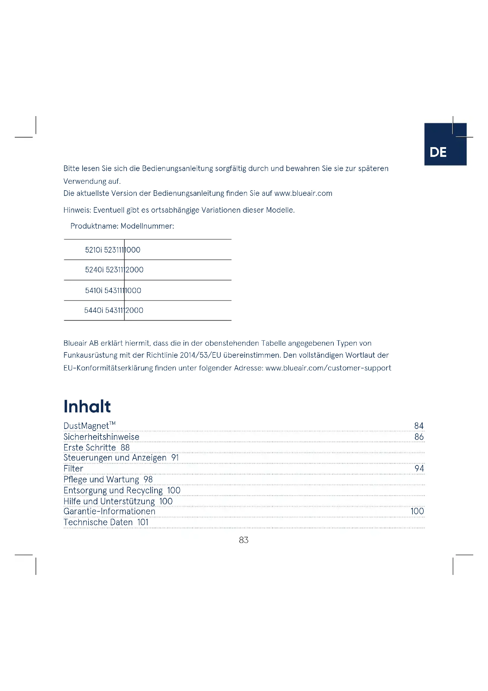 DustMagnet 84 Sicherheitshinweise 86 Erste Schritte 88 Steuerungen und Anzeigen 91 Filter 94 Pflege und Wartung 98 Entsorgung und Recycling 100 Hilfe und Unterstützung 100 Garantie-Informationen 100 Technische Daten 101 Inhalt Bitte lesen Sie sich die Bedienungsanleitung sorgfältig durch und bewahren Sie sie zur späteren Verwendung auf. Die aktuellste Version der Bedienungsanleitung finden Sie auf www.blueair.com Hinweis: Eventuell gibt es ortsabhängige Variationen dieser Modelle. Blueair AB erklärt hiermit, dass die in der obenstehenden Tabelle angegebenen Typen von Funkausrüstung mit der Richtlinie 2014/53/EU übereinstimmen. Den vollständigen Wortlaut der EU-Konformitätserklärung finden unter folgender Adresse: www.blueair.com/customer-support Produktname: Modellnummer: 5210i 5231111000 5240i 5231112000 5410i 5431111000 5440i 5431112000 TM84 Blueair DustMagnet Luftreiniger des Typs Blueair DustMagnet