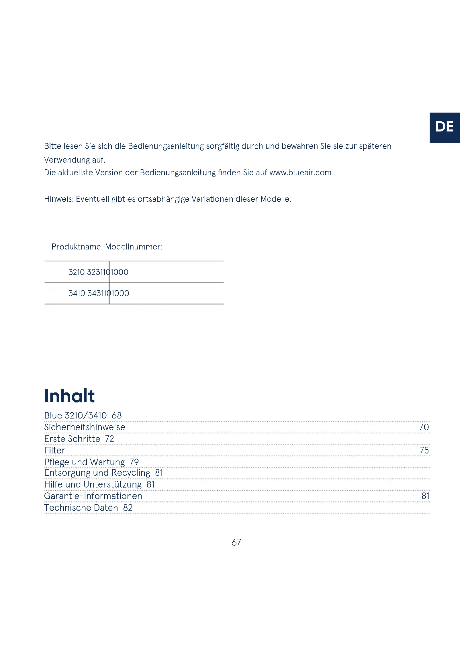 Blue 3210/3410 68 Sicherheitshinweise 70 Erste Schritte 72 Filter 75 Pflege und Wartung 79 Entsorgung und Recycling 81 Hilfe und Unterstützung 81 Garantie-Informationen 81 Technische Daten 82 Inhalt Bitte lesen Sie sich die Bedienungsanleitung sorgfältig durch und bewahren Sie sie zur späteren Verwendung auf. Die aktuellste Version der Bedienungsanleitung finden Sie auf www.blueair.com Hinweis: Eventuell gibt es ortsabhängige Variationen dieser Modelle. Produktname: Modellnummer: