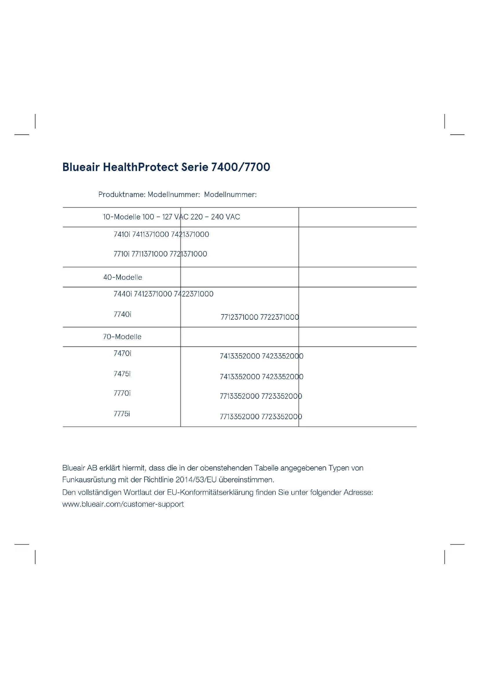 A norma ANSI/AHAM AC-1-201999Blueair AB erklärt hiermit, dass die in der obenstehenden Tabelle angegebenen Typen von Funkausrüstung mit der Richtlinie 2014/53/EU übereinstimmen. Den vollständigen Wortlaut der EU-Konformitätserklärung finden Sie unter folgender Adresse: www.blueair.com/customer-support Produktname: Modellnummer: Modellnummer: 10-Modelle 100 – 127 VAC 220 – 240 VAC 7410i 7411371000 7421371000 7710i 7711371000 7721371000 40-Modelle 7440i 7412371000 7422371000 7740i