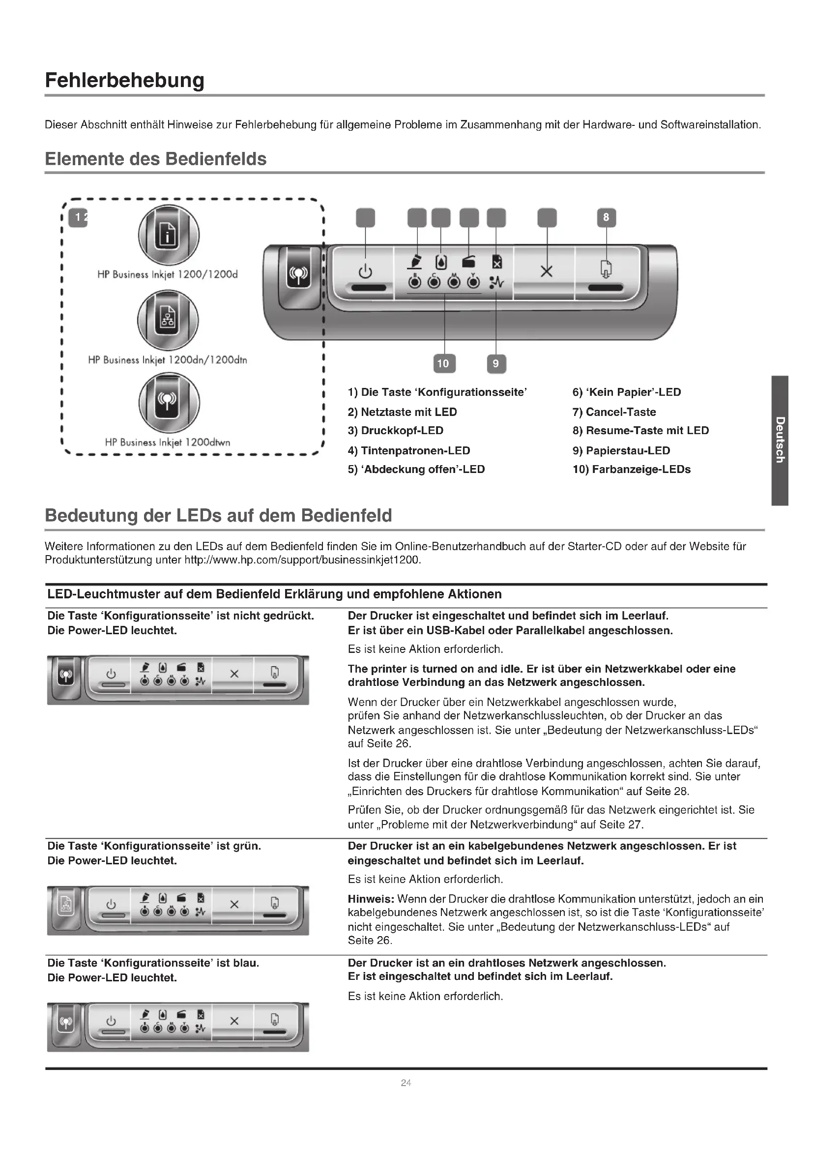 LED-Leuchtmuster auf dem Bedienfeld Erklärung und empfohlene Aktionen Die Taste ‘Konfigurationsseite’ ist nicht gedrückt. Die Power-LED leuchtet. Der Drucker ist eingeschaltet und befindet sich im Leerlauf. Er ist über ein USB-Kabel oder Parallelkabel angeschlossen. Es ist keine Aktion erforderlich. The printer is turned on and idle. Er ist über ein Netzwerkkabel oder eine drahtlose Verbindung an das Netzwerk angeschlossen. Wenn der Drucker über ein Netzwerkkabel angeschlossen wurde, prüfen Sie anhand der Netzwerkanschlussleuchten, ob der Drucker an das Netzwerk angeschlossen ist. Sie unter „Bedeutung der Netzwerkanschluss-LEDs“ auf Seite 26. Ist der Drucker über eine drahtlose Verbindung angeschlossen, achten Sie darauf, dass die Einstellungen für die drahtlose Kommunikation korrekt sind. Sie unter „Einrichten des Druckers für drahtlose Kommunikation“ auf Seite 28. Prüfen Sie, ob der Drucker ordnungsgemäß für das Netzwerk eingerichtet ist. Sie unter „Probleme mit der Netzwerkverbindung“ auf Seite 27. Die Taste ‘Konfigurationsseite’ ist grün. Die Power-LED leuchtet. Der Drucker ist an ein kabelgebundenes Netzwerk angeschlossen. Er ist eingeschaltet und befindet sich im Leerlauf. Es ist keine Aktion erforderlich. Hinweis: Wenn der Drucker die drahtlose Kommunikation unterstützt, jedoch an ein kabelgebundenes Netzwerk angeschlossen ist, so ist die Taste ‘Konfigurationsseite’ nicht eingeschaltet. Sie unter „Bedeutung der Netzwerkanschluss-LEDs“ auf Seite 26. Die Taste ‘Konfigurationsseite’ ist blau. Die Power-LED leuchtet. Der Drucker ist an ein drahtloses Netzwerk angeschlossen. Er ist eingeschaltet und befindet sich im Leerlauf. Es ist keine Aktion erforderlich. HPCrickMLK_GSG_UGFDIA.book Page 24 Wednesday, May 19, 2004 4:26 PM25 Deutsch Die Power-LED leuchtet. LED für „Kein Papier“ blinkt. Resume-Leuchte blinkt. Das Papierfach ist leer. Legen Sie Papier in den Drucker ein, und drücken Sie (Resume-Taste) , um fortzufahren. Die Power-LED leuchtet. Papierstau-LED blinkt. Resume-Leuchte blinkt. Papierstau im Drucker. Beseitigen Sie den Papierstau, und drücken Sie (Resume-Taste), um fortzufahren. Weitere Informationen hierzu finden Sie im Kapitel „Wartung und Fehlerbehebung“ im Online-Benutzerhandbuch. Die Power-LED leuchtet. ‘Abdeckung offen’-LED leuchtet. Eine Abdeckung ist nicht vollständig geschlossen. Achten Sie darauf, dass alle Abdeckungen vollständig geschlossen sind. Die Power-LED leuchtet. ‘Abdeckung offen’-LED leuchtet. Die hintere Abdeckung oder die Auto-Duplex-Einheit ist nicht vollständig eingesetzt. Achten Sie darauf, dass die hintere Abdeckung (HP Business Inkjet 1200) bzw. die Auto-Duplex-Einheit (HP Business Inkjet 1200d/1200dn/1200dtn/1200dtwn) an der Rückseite des Druckers vollständig eingesetzt ist. Die Power-LED leuchtet. Druckkopf-LED leuchtet. Die Druckkopfverriegelung ist nicht vollständig geschlossen. Öffnen Sie die obere Abdeckung und drücken Sie die Druckkopfverriegelung fest nach unten, bis diese vollständig einrastet. Achten Sie auch darauf, dass die Schutzfolie vom Druckkopf entfernt wird. Die Power-LED, die Tintenpatronen-LED und eine oder mehrere Farbanzeige-LEDs leuchten. Eine oder mehrere Tintenpatronen fehlen. Installieren Sie die Tintenpatronen und starten Sie den Druckvorgang. Wenn der Fehler weiterhin auftritt, ersetzen Sie die angezeigte(n) Tintenpatrone(n). Die Power-LED leuchtet. Die Druckkopf-LED und die zugehörige Farbanzeige-LED blinken. Ein oder mehrere Druckköpfe müssen überprüft werden. Installieren Sie die Druckköpfe neu und starten Sie den Druckvorgang. Reinigen Sie die Druckkopfkontakte. Siehe “Warten der Druckköpfe”. Wenn der Fehler weiterhin auftritt, ersetzen Sie den bzw. die angezeigten Druckköpfe. Die Power-LED, die Druckkopf-LED und eine oder mehrere Farbanzeige-LEDs leuchten. Ein oder mehrere Druckköpfe fehlen. Achten Sie darauf, dass die Schutzfolie vom Druckkopf entfernt wurde. Installieren Sie die Druckköpfe neu und starten Sie den Druckvorgang. Die Power-LED leuchtet. Eine oder mehrere Farbanzeige-LEDs leuchten. Eine oder mehrere Tintenpatronen sind weitgehend verbraucht und müssen bald ersetzt werden. Es ist keine Aktion erforderlich. HPCrickMLK_GSG_UGFDIA.book Page 25 Wednesday, May 19, 2004 4:26 PM26 Netzwerkanschlusselemente Bedeutung der Netzwerkanschluss-LEDs Hinweis: Die drahtlose Kommunikation des Druckers wird ausgeschaltet, wenn der Drucker über ein Netzwerkkabel angeschlossen wird. Die Power-LED leuchtet. Eine oder mehrere Farbanzeige-LEDs blinken. Eine Tintenpatrone ist leer und muss ersetzt werden, bevor Sie den Druckvorgang fortsetzen können. Ersetzen Sie die angezeigte Tintenpatrone.