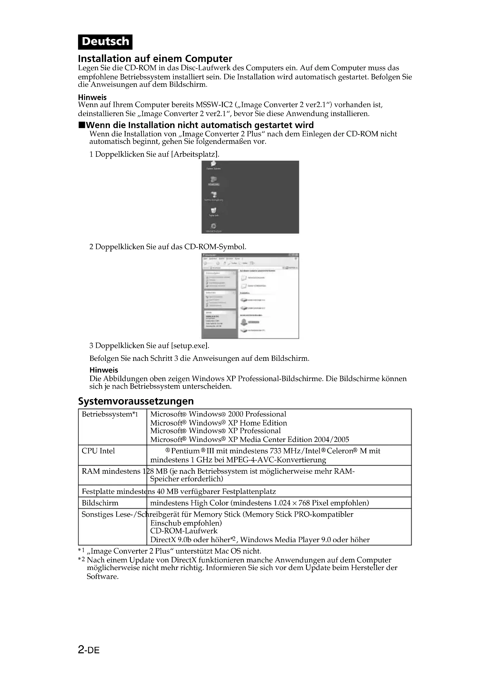 » ne sont pas spécifiés dans le présent manuel.2-DE Deutsch Installation auf einem Computer Legen Sie die CD-ROM in das Disc-Laufwerk des Computers ein. Auf dem Computer muss das empfohlene Betriebssystem installiert sein. Die Installation wird automatisch gestartet. Befolgen Sie die Anweisungen auf dem Bildschirm. Hinweis Wenn auf Ihrem Computer bereits MSSW-IC2 („Image Converter 2 ver2.1“) vorhanden ist, deinstallieren Sie „Image Converter 2 ver2.1“, bevor Sie diese Anwendung installieren. x Wenn die Installation nicht automatisch gestartet wird Wenn die Installation von „Image Converter 2 Plus“ nach dem Einlegen der CD-ROM nicht automatisch beginnt, gehen Sie folgendermaßen vor. 1 Doppelklicken Sie auf [Arbeitsplatz]. 2 Doppelklicken Sie auf das CD-ROM-Symbol. 3 Doppelklicken Sie auf [setup.exe]. Befolgen Sie nach Schritt 3 die Anweisungen auf dem Bildschirm. Hinweis Die Abbildungen oben zeigen Windows XP Professional-Bildschirme. Die Bildschirme können sich je nach Betriebssystem unterscheiden. Systemvoraussetzungen Betriebssystem*