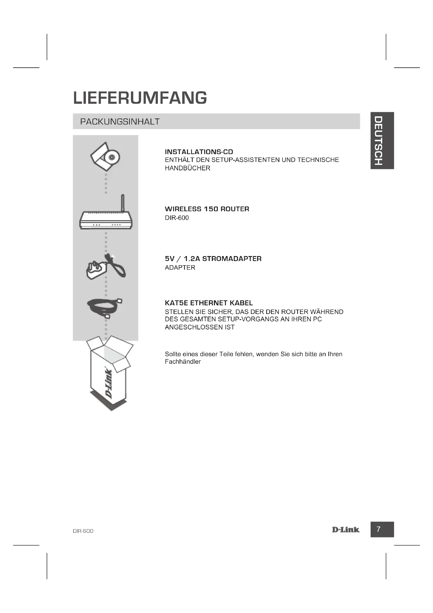 ANGESCHLOSSEN IST Sollte eines dieser Teile fehlen, wenden Sie sich bitte an Ihren FachhändlerDIR-600