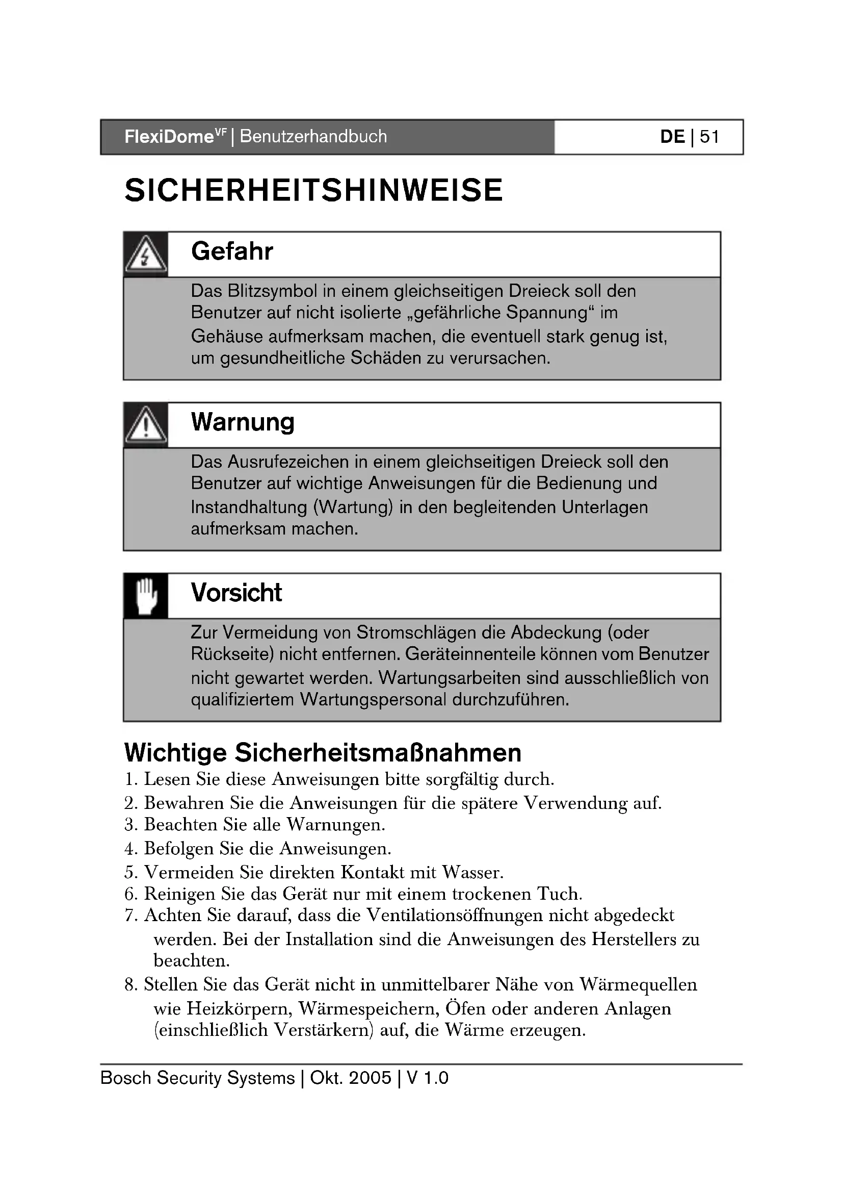 | Benutzerhandbuch Bosch Security Systems | Okt. 2005 | V 1.0 DE | 51 SICHERHEITSHINWEISE Wichtige Sicherheitsmaßnahmen