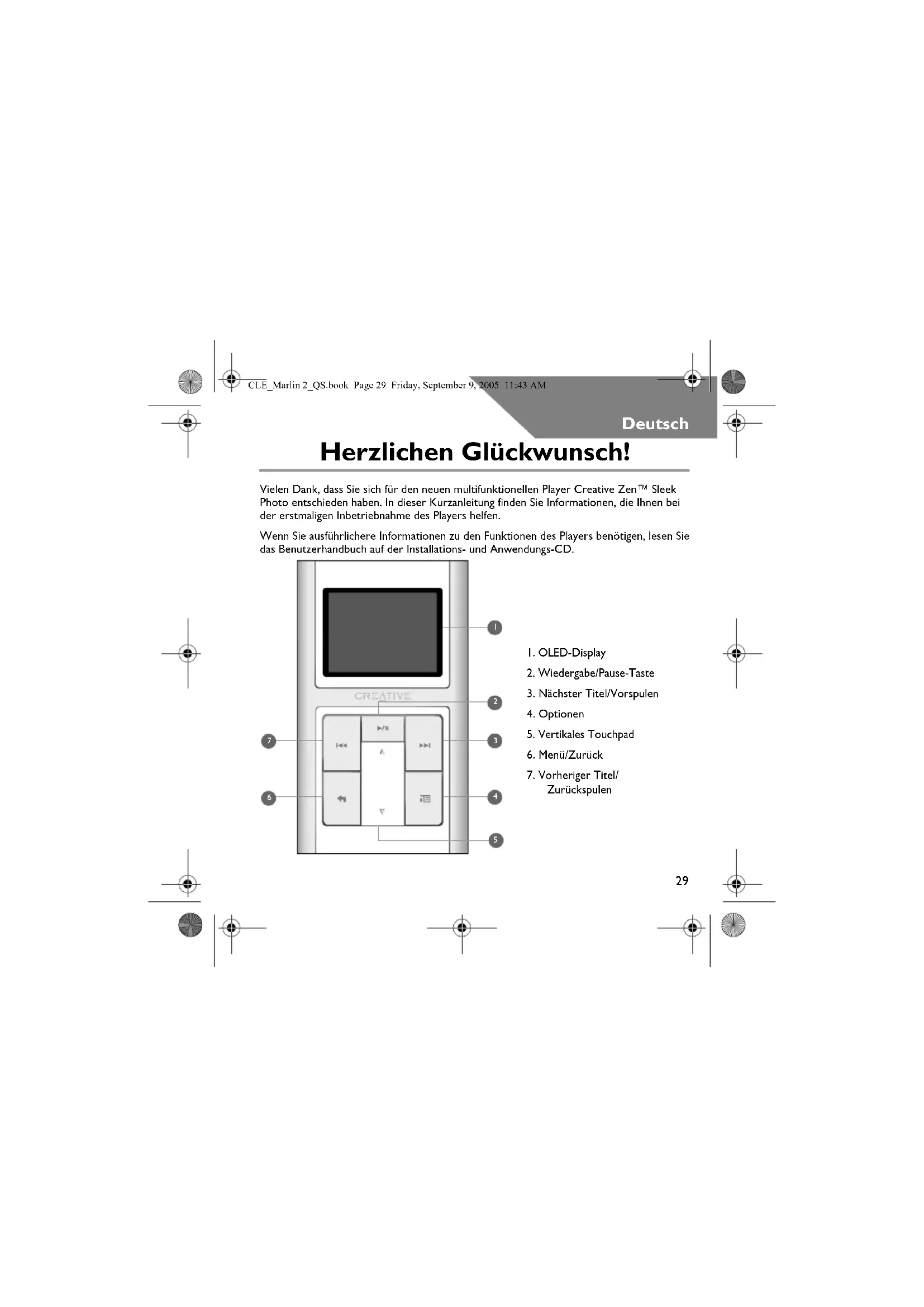 - Versuchen Sie unter keinen Umständen, den integrierten Akku auszubauen. Die Entsorgung des Player muss unter Einhaltung der regional geltenden Umweltbestimmungen erfolgen. Zum Austauschen des Akkus senden Sie den Player bitte an die Kundendienstniederlassung in Ihrer Nähe. Informationen zum Kundendienst finden Sie unter www.creative.com Eine unsachgemäße Bedienung kann zum Verlust Ihrer Garantieansprüche führen. Weitere Informationen enthält die zum Lieferumfang des Produkts gehörende Garantieerklärung. CLE_Marlin 2_QS.book Page 42 Friday, September 9, 2005 11:43 AM43 Das WEEE-Symbol zeigt an, dass das damit gekennzeichnete Produkt nicht als normaler Haushaltsabfall entsorgt werden soll. Durch eine fachgerechte Entsorgung dieses Gerätes leisten Sie einen wichtigen Beitrag zum Umweltschutz. Ausführliche Informationen zur Entsorgung dieses Produkts erhalten Sie bei Ihrer regionalen Behörde, bei Ihrem Abfallentsorgungsunternehmen oder in dem Geschäft, in dem Sie das Produkt erworben haben. Copyright © 2005, Creative Technology Ltd. Alle Rechte vorbehalten. Das Creative-Logo, Zen und Creative MediaSource sind Marken oder eingetragene Marken von Creative Technology Ltd. in den USA und/oder anderen Ländern. Windows ist eine eingetragene Marke der Microsoft Corporation. Gracenote ist eine eingetragene Marke der Gracenote, Inc. CLE_Marlin 2_QS.book Page 43 Friday, September 9, 2005 11:43 AM44 Italiano Complimenti! Grazie per aver acquistato il lettore multiformato di Creative, Creative Zen™ Sleek Photo. In questa sezione è riportata un'introduzione al nuovo lettore. Per sfruttare al massimo il lettore, leggere anche il manuale dell'utente completo disponibile sul CD di installazione e delle applicazioni.