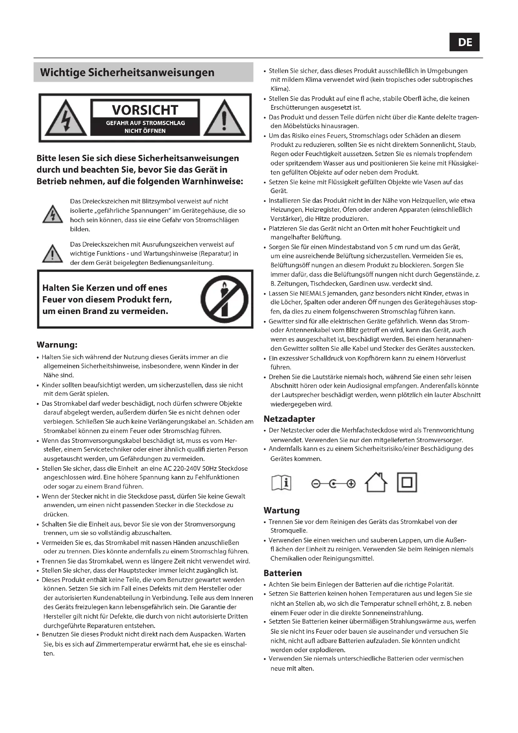 Bitte lesen Sie sich diese Sicherheitsanweisungen durch und beachten Sie, bevor Sie das Gerät in Betrieb nehmen, auf die folgenden Warnhinweise: Das Dreieckszeichen mit Blitzsymbol verweist auf nicht isolierte „gefährliche Spannungen“ im Gerätegehäuse, die so hoch sein können, dass sie eine Gefahr von Stromschlägen bilden. Das Dreieckszeichen mit Ausrufungszeichen verweist auf wichtige Funktions - und Wartungshinweise (Reparatur) in der dem Gerät beigelegten Bedienungsanleitung. Halten Sie Kerzen und o enes Feuer von diesem Produkt fern, um einen Brand zu vermeiden. Warnung: