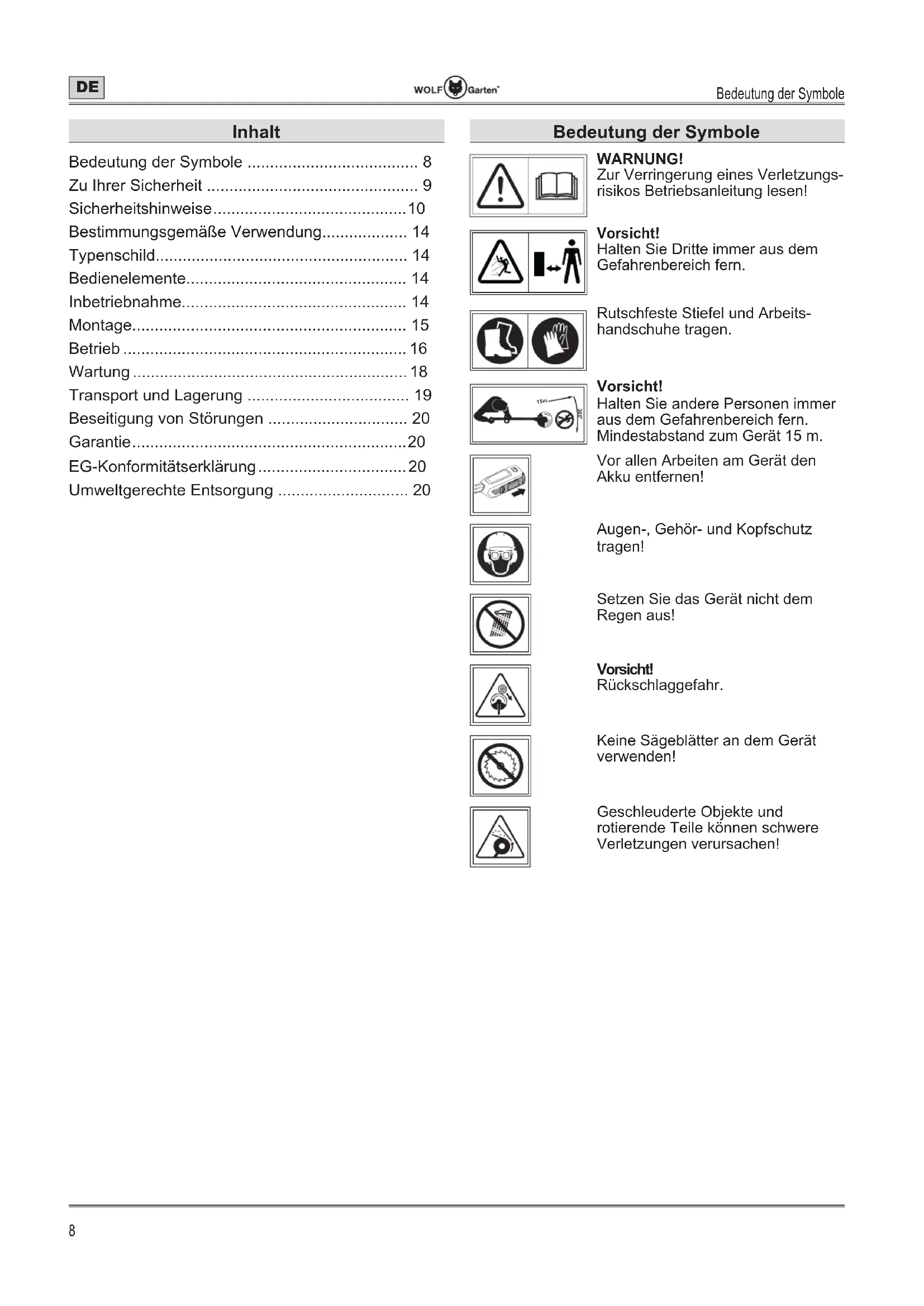 - 15m Vorsicht! Halten Sie andere Personen immer aus dem Gefahrenbereich fern. Mindestabstand zum Gerät 15 m. Vor allen Arbeiten am Gerät den Akku entfernen! Augen-, Gehör- und Kopfschutz tragen! Setzen Sie das Gerät nicht dem Regen aus! Vorsicht! Rückschlaggefahr. Keine Sägeblätter an dem Gerät verwenden! Geschleuderte Objekte und rotierende Teile können schwere Verletzungen verursachen! Inhalt Bedeutung der Symbole p. 8