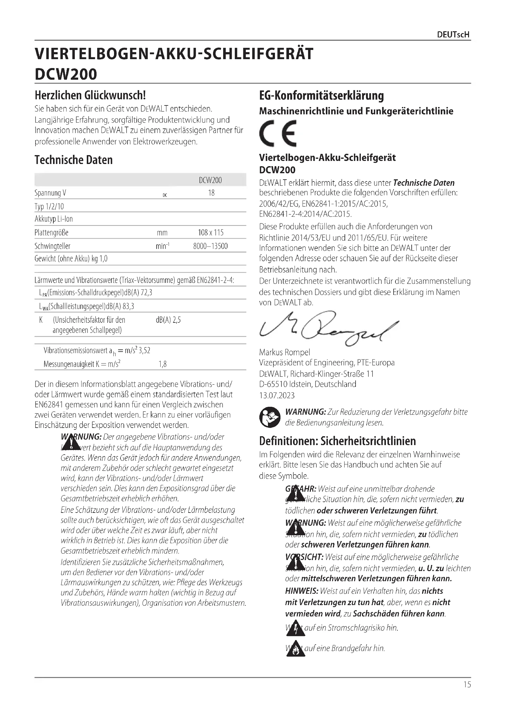 - Li-Ion celler er genanvendelige. Tag dem med til din forhandler eller til den lokale genbrugsplads. De indsamlede batteripakker vil blive genanvendt eller korrektbortskaffet. Med enheden følger der en støvåbning, som passer til batterier på 5Ah ogderunder. En støvåbning til batterier på 6Ah og derover kan købes som servicedel (N684701).15 DEUTscH WARNUNG: Zur Reduzierung der Verletzungsgefahr bitte die Bedienungsanleitunglesen. Definitionen: Sicherheitsrichtlinien Im Folgenden wird die Relevanz der einzelnen Warnhinweise erklärt. Bitte lesen Sie das Handbuch und achten Sie auf dieseSymbole. GEFAHR: Weist auf eine unmittelbar drohende gefährliche Situation hin, die, sofern nicht vermieden, zu tödlichen oder schweren Verletzungenführt. WARNUNG: Weist auf eine möglicherweise gefährliche Situation hin, die, sofern nicht vermieden, zu tödlichen oder schweren Verletzungen führenkann. VORSICHT: Weist auf eine möglicherweise gefährliche Situation hin, die, sofern nicht vermieden, u. U. zu leichten oder mittelschweren Verletzungen führenkann. HINWEIS: Weist auf ein Verhalten hin, das nichts mit Verletzungen zu tun hat, aber, wenn es nicht vermieden wird, zu Sachschäden führenkann. Weist auf ein Stromschlagrisikohin. Weist auf eine Brandgefahrhin. EG‑Konformitätserklärung Maschinenrichtlinie und Funkgeräterichtlinie Viertelbogen-Akku-Schleifgerät DCW200 DeWALT erklärt hiermit, dass diese unter Technische Daten beschriebenen Produkte die folgenden Vorschriften erfüllen: 2006/42/EG, EN62841-1:2015/AC:2015, EN62841-2-4:2014/AC:2015.Diese Produkte erfüllen auch die Anforderungen von Richtlinie 2014/53/EU und 2011/65/EU. Für weitere Informationen wenden Sie sich bitte an DeWALT unter der folgenden Adresse oder schauen Sie auf der Rückseite dieser Betriebsanleitungnach.Der Unterzeichnete ist verantwortlich für die Zusammenstellung des technischen Dossiers und gibt diese Erklärung im Namen von DeWALTab.Markus Rompel Vizepräsident of Engineering, PTE-Europa DeWALT, Richard-Klinger-Straße 11 D-65510Idstein, Deutschland 13.07.2023Der in diesem Informationsblatt angegebene Vibrations- und/oder Lärmwert wurde gemäß einem standardisierten Test laut 62841 gemessen und kann für einen Vergleich zwischen zwei Geräten verwendet werden. Er kann zu einer vorläufigen Einschätzung der Exposition verwendetwerden. WARNUNG: Der angegebene Vibrations- und/oder Lärmwert bezieht sich auf die Hauptanwendung des Gerätes. Wenn das Gerät jedoch für andere Anwendungen, mit anderem Zubehör oder schlecht gewartet eingesetzt wird, kann der Vibrations- und/oder Lärmwert verschieden sein. Dies kann den Expositionsgrad über die Gesamtbetriebszeit erheblicherhöhen.Eine Schätzung der Vibrations- und/oder Lärmbelastung sollte auch berücksichtigen, wie oft das Gerät ausgeschaltet wird oder über welche Zeit es zwar läuft, aber nicht wirklich in Betrieb ist. Dies kann die Exposition über die Gesamtbetriebszeit erheblichmindern.Identifizieren Sie zusätzliche Sicherheitsmaßnahmen, um den Bediener vor den Vibrations- und/oder Lärmauswirkungen zu schützen, wie: Pflege des Werkzeugs und Zubehörs, Hände warm halten (wichtig in Bezug auf Vibrationsauswirkungen), Organisation vonArbeitsmustern.DCW200Spannung V