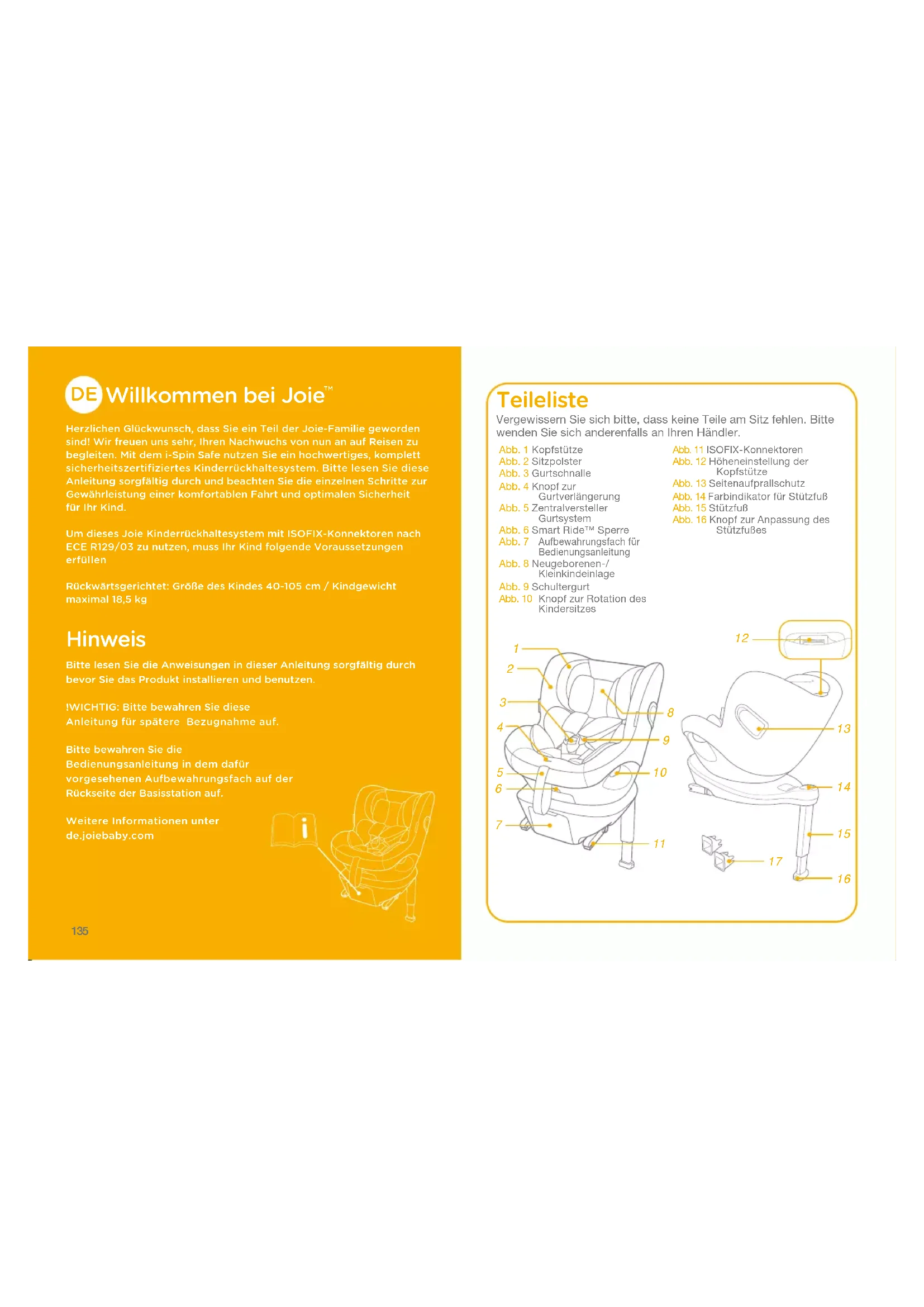 Herzlichen Glückwunsch, dass Sie ein Teil der Joie-Familie geworden sind! Wir freuen uns sehr, Ihren Nachwuchs von nun an auf Reisen zu begleiten. Mit dem i-Spin Safe nutzen Sie ein hochwertiges, komplett sicherheitszertifiziertes Kinderrückhaltesystem. Bitte lesen Sie diese Anleitung sorgfältig durch und beachten Sie die einzelnen Schritte zur Gewährleistung einer komfortablen Fahrt und optimalen Sicherheit für Ihr Kind.Um dieses Joie Kinderrückhaltesystem mit ISOFIX-Konnektoren nach ECE R129/03 zu nutzen, muss Ihr Kind folgende Voraussetzungen erfüllenRückwärtsgerichtet: Größe des Kindes 40-105 cm / Kindgewicht maximal 18,5 kg Hinweis Bitte lesen Sie die Anweisungen in dieser Anleitung sorgfältig durch bevor Sie das Produkt installieren und benutzen.!WICHTIG: Bitte bewahren Sie diese Anleitung für spätere Bezugnahme auf.Bitte bewahren Sie die Bedienungsanleitung in dem dafür vorgesehenen Aufbewahrungsfach auf der Rückseite der Basisstation auf. Weitere Informationen unter de.joiebaby.com