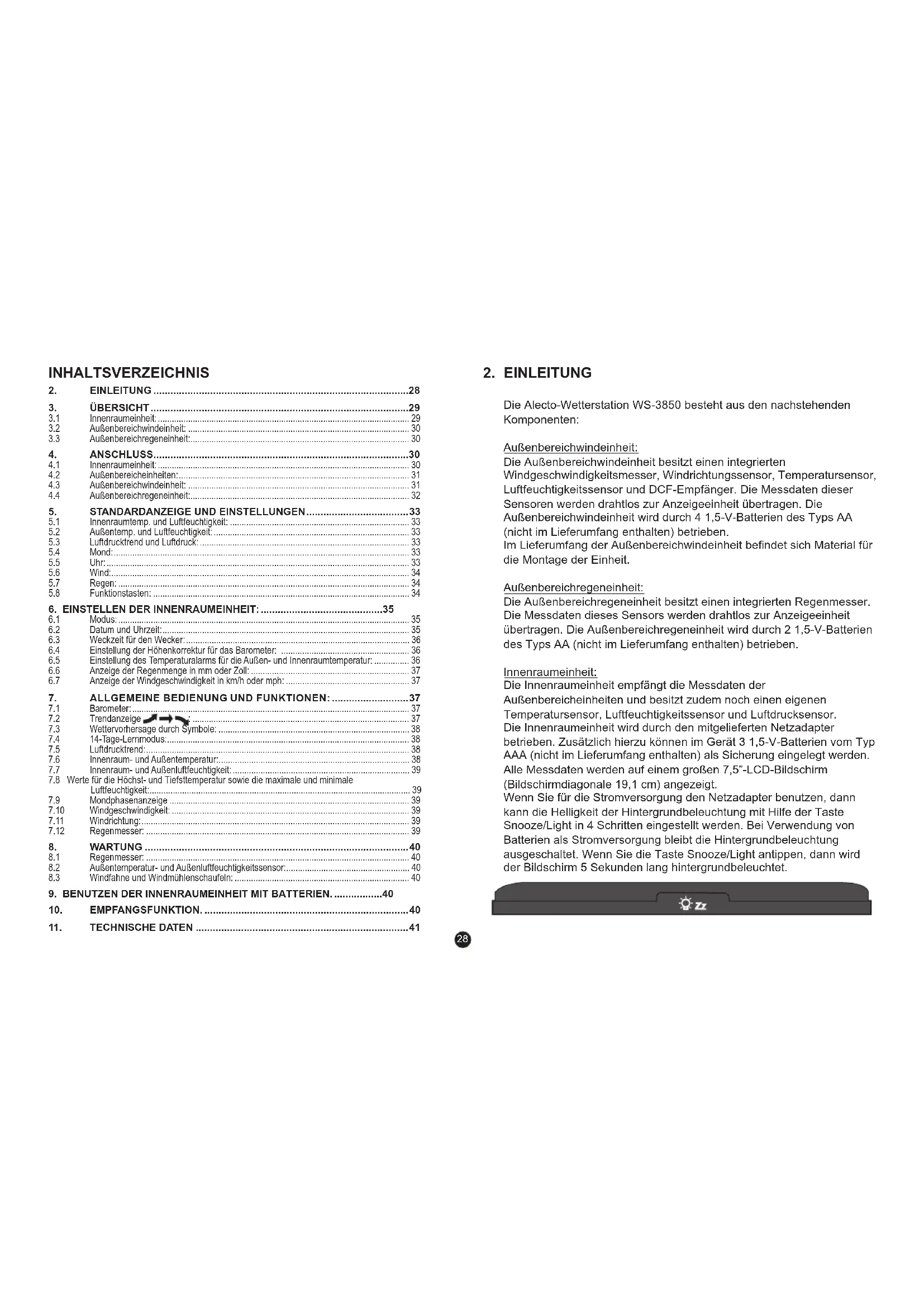 Die Alecto-Wetterstation WS-3850 besteht aus den nachstehenden Komponenten: Außenbereichwindeinheit: Die Außenbereichwindeinheit besitzt einen integrierten Windgeschwindigkeitsmesser, Windrichtungssensor, Temperatursensor, Luftfeuchtigkeitssensor und DCF-Empfänger. Die Messdaten dieser Sensoren werden drahtlos zur Anzeigeeinheit übertragen. Die Außenbereichwindeinheit wird durch 4 1,5-V-Batterien des Typs AA (nicht im Lieferumfang enthalten) betrieben. Im Lieferumfang der Außenbereichwindeinheit bendet sich Material für die Montage der Einheit. Außenbereichregeneinheit: Die Außenbereichregeneinheit besitzt einen integrierten Regenmesser. Die Messdaten dieses Sensors werden drahtlos zur Anzeigeeinheit übertragen. Die Außenbereichregeneinheit wird durch 2 1,5-V-Batterien des Typs AA (nicht im Lieferumfang enthalten) betrieben. Innenraumeinheit: Die Innenraumeinheit empfängt die Messdaten der Außenbereicheinheiten und besitzt zudem noch einen eigenen Temperatursensor, Luftfeuchtigkeitssensor und Luftdrucksensor. Die Innenraumeinheit wird durch den mitgelieferten Netzadapter betrieben. Zusätzlich hierzu können im Gerät 3 1,5-V-Batterien vom Typ AAA (nicht im Lieferumfang enthalten) als Sicherung eingelegt werden. Alle Messdaten werden auf einem großen 7,5”-LCD-Bildschirm (Bildschirmdiagonale 19,1 cm) angezeigt. Wenn Sie für die Stromversorgung den Netzadapter benutzen, dann kann die Helligkeit der Hintergrundbeleuchtung mit Hilfe der Taste Snooze/Light in 4 Schritten eingestellt werden. Bei Verwendung von Batterien als Stromversorgung bleibt die Hintergrundbeleuchtung ausgeschaltet. Wenn Sie die Taste Snooze/Light antippen, dann wird der Bildschirm 5 Sekunden lang hintergrundbeleuchtet. INHALTSVERZEICHNIS