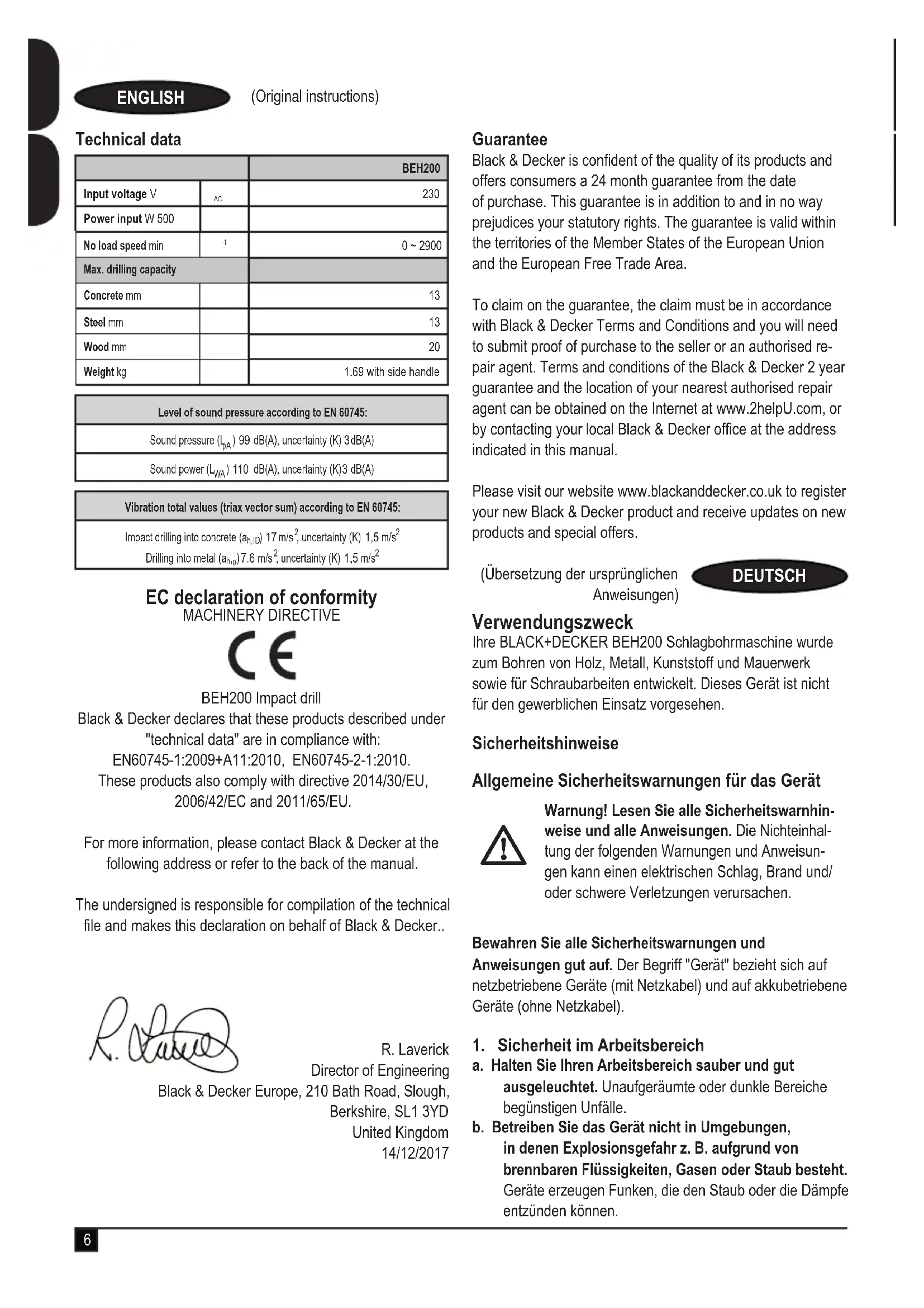 EU-Konformitätserklärung MASCHINENRICHTLINIE BEH200 Schlagbohrmaschine Black & Decker erklärt, dass die in den technischen Daten beschriebenen Geräte übereinstimmen mit: EN60745-1:2009+A11:2010, EN60745-2-1:2010. Diese Produkte entsprechen außerdem den Richtlinien 2014/30/EU, 2006/42/EC und 2011/65/EU. Weitere Informationen erhalten Sie von Black & Decker unter der folgenden Adresse. Diese bendet sich auch auf der Rückseite dieser Anleitung. Der Unterzeichnete ist verantwortlich für die Zusammenstellung der technischen Daten und gibt diese Erklärung im Namen von Black & Decker ab. R. Laverick Director of Engineering Black & Decker Europe, 210 Bath Road, Slough, Berkshire, SL1 3YD Vereinigtes Königreich