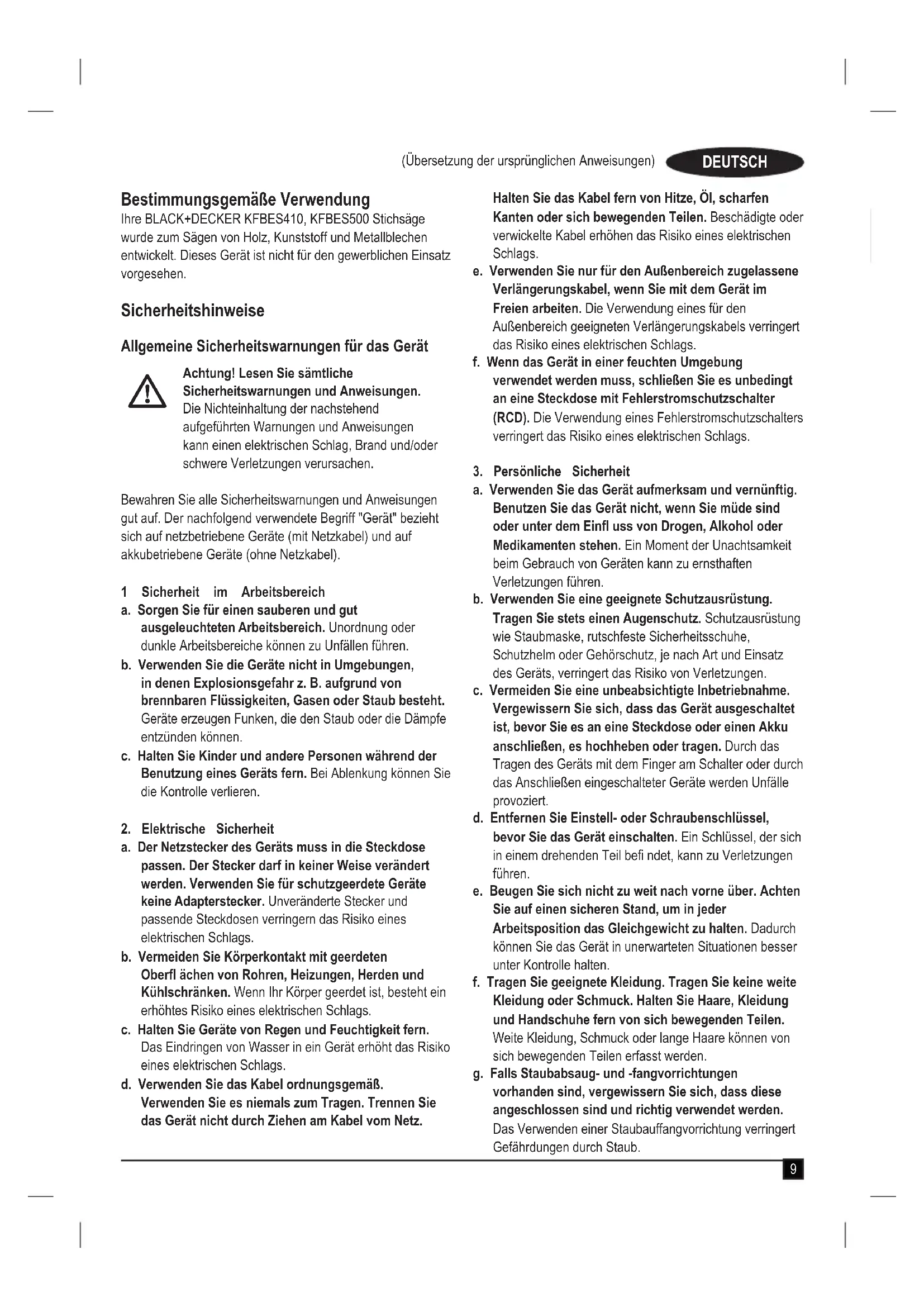 (Übersetzung der ursprünglichen Anweisungen) DEUTSCH (Traduction des instructions initiales) FRANÇAIS (Traduction des instructions initiales) FRANÇAIS Garantie Black & Decker vertraut auf die Qualität der eigenen Geräte und bietet dem Käufer eine außergewöhnliche Garantie von 24 Monaten ab Kaufdatum. Diese Garantie versteht sich unbeschadet der gesetzlichen Gewährleistungsansprüche und schränkt diese keinesfalls ein. Diese Garantie gilt innerhalb der Staatsgebiete der Mitgliedstaaten der Europäischen Union und der Europäischen Freihandelszone. Zur Inanspruchnahme dieser Garantie muss sie den allgemeinen Geschäftsbedingungen von Black & Decker entsprechen und dem Verkäufer bzw. der Vertragswerkstatt ist ein Kaufnachweis vorzulegen. Die Bedingungen für die 2-jährige Garantie von Black & Decker und den Standort Ihrer nächstgelegenen Vertragswerkstatt fi nden Sie im Internet unter www.2helpU.com oder indem Sie sich an die lokale Black & Decker-Niederlassung wenden, deren Adresse Sie in dieser Anleitung fi nden. Ihr neues Black & Decker Produkt können Sie auf unserer Website unter www.blackanddecker.de registrieren. Dort erhalten Sie auch Informationen über neue Produkte und Sonderangebote. Usage prévu Votre scie sauteuse KFBES410, KFBES500 BLACK+DECKER a été spécialement conçue pour scier du bois, des plastiques et de la tôle. Cet outil est destiné à une utilisation exclusivement domestique. Consignes de sécurité Consignes de sécurité concernant les outils électroportatifs