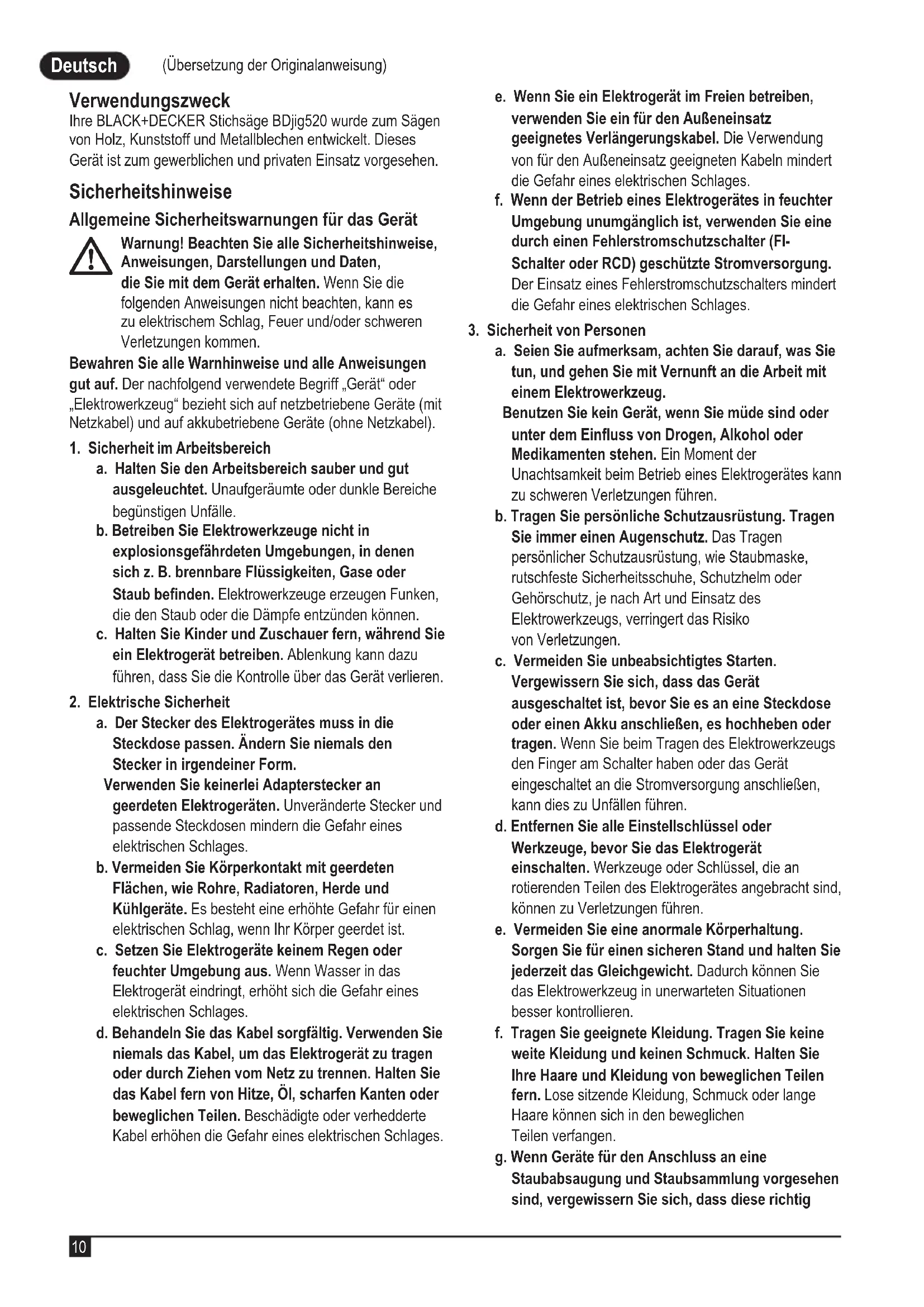 (Übersetzung der Originalanweisung) Deutsch (Übersetzung der Originalanweisung) Verwendungszweck Ihre BLACK+DECKER Stichsäge BDjig520 wurde zum Sägen von Holz, Kunststoff und Metallblechen entwickelt. Dieses Gerät ist zum gewerblichen und privaten Einsatz vorgesehen. Sicherheitshinweise Allgemeine Sicherheitswarnungen für das Gerät