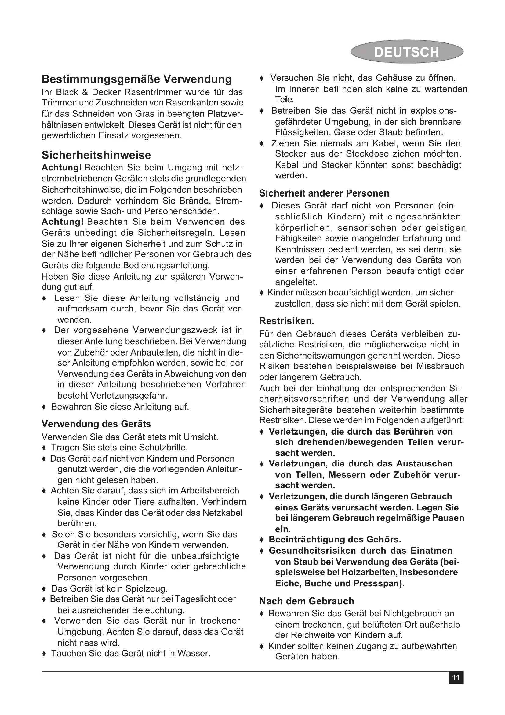 Guarantee Black & Decker is confi dent of the quality of its products and offers an outstanding guarantee. This guarantee statement is in addition to and in no way prejudices your statutory rights. The guarantee is valid within the territories of the Member States of the European Union and the European Free Trade Area. If a Black & Decker product becomes defective due to faulty materials, workmanship or lack of conform- ity, within 24 months from the date of purchase, Black & Decker guarantees to replace defective parts, repair products subjected to fair wear and tear or replace such products to ensure minimum inconvenience to the customer unless: ENGLISH10 ♦ The product has been used for trade, profes- sional or hire purposes; ♦ The product has been subjected to misuse or neglect; ♦ The product has sustained damage through foreign objects, substances or accidents; ♦ Repairs have been attempted by persons other than authorised repair agents or Black & Decker service staff. To claim on the guarantee, you will need to submit proof of purchase to the seller or an authorised repair agent. You can check the location of your nearest authorised repair agent by contacting your local Black & Decker offi ce at the address indicated in this manual. Alternatively, a list of authorised Black & Decker repair agents and full details of our after-sales service and contacts are available on the Internet at: www.2helpU.com Please visit our website www.blackanddecker.co.uk to register your new Black & Decker product and to be kept up to date on new products and special offers. Further information on the Black & Decker brand and our range of products is available at www.blackanddecker.co.uk. ENGLISH11 DEUTSCH Bestimmungsgemäße Verwendung Ihr Black & Decker Rasentrimmer wurde für das Trimmen und Zuschneiden von Rasenkanten sowie für das Schneiden von Gras in beengten Platzver- hältnissen entwickelt. Dieses Gerät ist nicht für den gewerblichen Einsatz vorgesehen. Sicherheitshinweise Achtung! Beachten Sie beim Umgang mit netz- strombetriebenen Geräten stets die grundlegenden Sicherheitshinweise, die im Folgenden beschrieben werden. Dadurch verhindern Sie Brände, Strom- schläge sowie Sach- und Personenschäden. Achtung! Beachten Sie beim Verwenden des Geräts unbedingt die Sicherheitsregeln. Lesen Sie zu Ihrer eigenen Sicherheit und zum Schutz in der Nähe befi ndlicher Personen vor Gebrauch des Geräts die folgende Bedienungsanleitung. Heben Sie diese Anleitung zur späteren Verwen- dung gut auf. ♦ Lesen Sie diese Anleitung vollständig und aufmerksam durch, bevor Sie das Gerät ver- wenden. ♦ Der vorgesehene Verwendungszweck ist in dieser Anleitung beschrieben. Bei Verwendung von Zubehör oder Anbauteilen, die nicht in die- ser Anleitung empfohlen werden, sowie bei der Verwendung des Geräts in Abweichung von den in dieser Anleitung beschriebenen Verfahren besteht Verletzungsgefahr. ♦ Bewahren Sie diese Anleitung auf. Verwendung des Geräts Verwenden Sie das Gerät stets mit Umsicht. ♦ Tragen Sie stets eine Schutzbrille. ♦ Das Gerät darf nicht von Kindern und Personen genutzt werden, die die vorliegenden Anleitun- gen nicht gelesen haben. ♦ Achten Sie darauf, dass sich im Arbeitsbereich keine Kinder oder Tiere aufhalten. Verhindern Sie, dass Kinder das Gerät oder das Netzkabel berühren. ♦ Seien Sie besonders vorsichtig, wenn Sie das Gerät in der Nähe von Kindern verwenden. ♦ Das Gerät ist nicht für die unbeaufsichtigte Verwendung durch Kinder oder gebrechliche Personen vorgesehen. ♦ Das Gerät ist kein Spielzeug. ♦ Betreiben Sie das Gerät nur bei Tageslicht oder bei ausreichender Beleuchtung. ♦ Verwenden Sie das Gerät nur in trockener Umgebung. Achten Sie darauf, dass das Gerät nicht nass wird. ♦ Tauchen Sie das Gerät nicht in Wasser. ♦ Versuchen Sie nicht, das Gehäuse zu öffnen. Im Inneren befi nden sich keine zu wartenden Teile. ♦ Betreiben Sie das Gerät nicht in explosions- gefährdeter Umgebung, in der sich brennbare Flüssigkeiten, Gase oder Staub befi nden. ♦ Ziehen Sie niemals am Kabel, wenn Sie den Stecker aus der Steckdose ziehen möchten. Kabel und Stecker könnten sonst beschädigt werden. Sicherheit anderer Personen ♦ Dieses Gerät darf nicht von Personen (ein- schließlich Kindern) mit eingeschränkten körperlichen, sensorischen oder geistigen Fähigkeiten sowie mangelnder Erfahrung und Kenntnissen bedient werden, es sei denn, sie werden bei der Verwendung des Geräts von einer erfahrenen Person beaufsichtigt oder angeleitet. ♦ Kinder müssen beaufsichtigt werden, um sicher- zustellen, dass sie nicht mit dem Gerät spielen. Restrisiken. Für den Gebrauch dieses Geräts verbleiben zu- sätzliche Restrisiken, die möglicherweise nicht in den Sicherheitswarnungen genannt werden. Diese Risiken bestehen beispielsweise bei Missbrauch oder längerem Gebrauch. Auch bei der Einhaltung der entsprechenden Si- cherheitsvorschriften und der Verwendung aller Sicherheitsgeräte bestehen weiterhin bestimmte Restrisiken. Diese werden im Folgenden aufgeführt: ♦ Verletzungen, die durch das Berühren von sich drehenden/bewegenden Teilen verur- sacht werden. ♦ Verletzungen, die durch das Austauschen von Teilen, Messern oder Zubehör verur- sacht werden. ♦ Verletzungen, die durch längeren Gebrauch eines Geräts verursacht werden. Legen Sie bei längerem Gebrauch regelmäßige Pausen ein. ♦ Beeinträchtigung des Gehörs. ♦ Gesundheitsrisiken durch das Einatmen von Staub bei Verwendung des Geräts (bei- spielsweise bei Holzarbeiten, insbesondere Eiche, Buche und Pressspan). Nach dem Gebrauch ♦ Bewahren Sie das Gerät bei Nichtgebrauch an einem trockenen, gut belüfteten Ort außerhalb der Reichweite von Kindern auf. ♦ Kinder sollten keinen Zugang zu aufbewahrten Geräten haben.12 DEUTSCH ♦ Wenn das Gerät in einem Fahrzeug transpor- tiert oder gelagert wird, bewahren Sie es im Kofferraum oder einer geeigneten Ablage auf, damit es bei pl