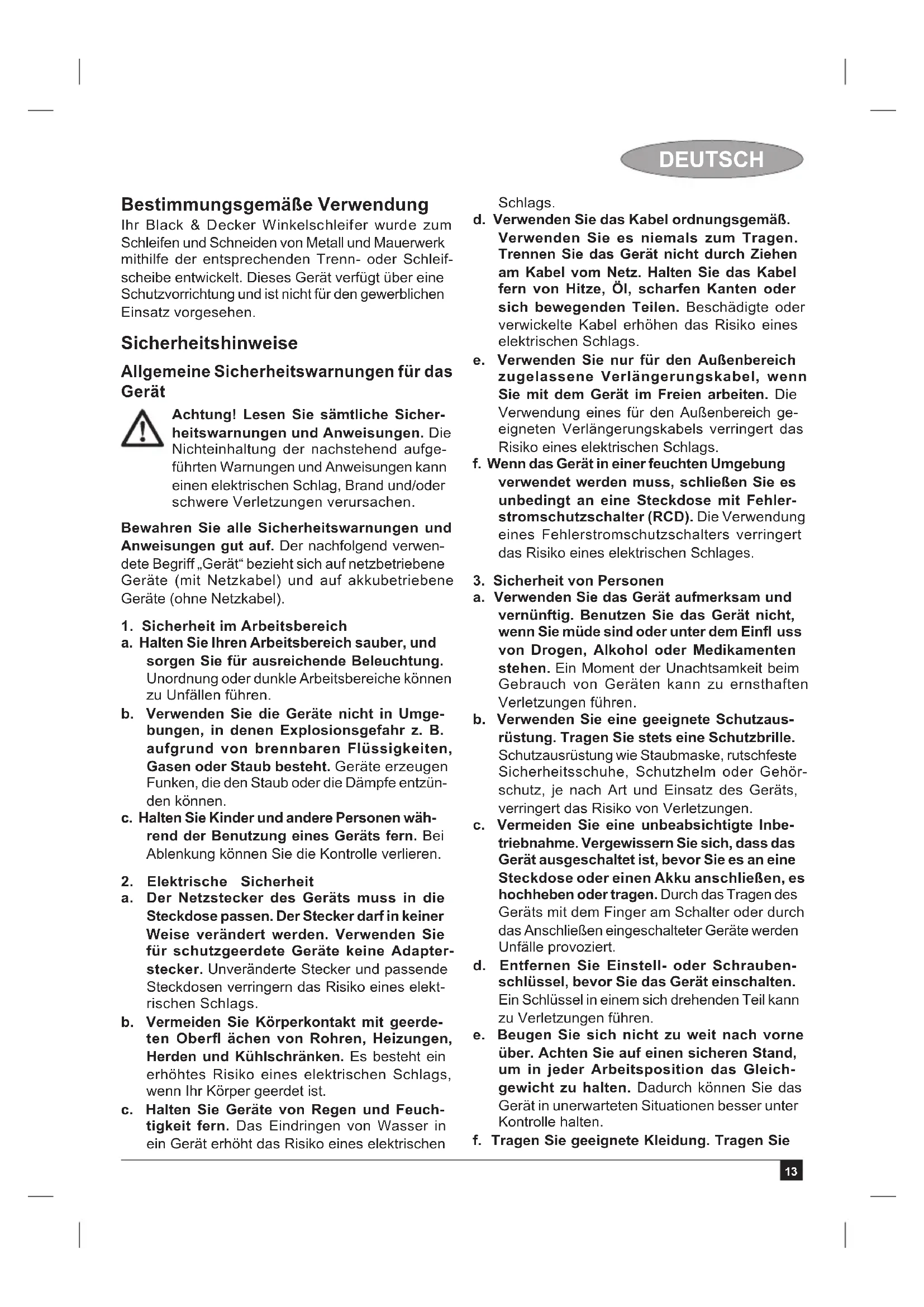 EG-Konformitätserklärung MASCHINENRICHTLINIE KG701 / KG901 / KG902 Black & Decker erklärt, dass diese unter “Techni- sche Daten” beschriebenen Geräte übereinstimmen mit: 2006/42/EG, EN 60745-1, EN 60745-2-3. Diese Produkte entsprechen außerdem den Richt- linien 2004/108/EG und 2011/65/EU. Weitere Informationen erhalten Sie von Black & De- cker unter der folgenden Adresse. Diese befi ndet sich auch auf der Rückseite dieser Anleitung. Der Unterzeichnete ist verantwortlich für die Zusam- menstellung der technischen Daten und gibt diese Erklärung im Namen von Black & Decker ab. Kevin Hewitt Vice-President Global Engineering Black & Decker Europe, 210 Bath Road, Slough, Berkshire, SL1 3YD, United Kingdom 30/03/2012 Garantie Black & Decker vertraut auf die Qualität der eigenen Geräte und bietet dem Käufer eine außergewöhnli- che Garantie. Diese Garantiezusage versteht sich unbeschadet der gesetzlichen Gewährleistungsan- sprüche und schränkt diese keinesfalls ein. Sie gilt in sämtlichen Mitgliedstaaten der Europäischen Union und der Europäischen Freihandelszone EFTA. Tritt innerhalb von 24 Monaten ab Kaufdatum an ei- nem Gerät von Black & Decker ein auf Material- oder Verarbeitungsfehler zurückzuführender Mangel auf, garantiert Black & Decker den Austausch defekter Teile, die Reparatur von Geräten mit üblichem Verschleiß bzw. den Austausch eines mangel- haften Gerätes, ohne den Kunden dabei mehr als unbedingt nötig in Anspruch zu nehmen, allerdings vorbehaltlich folgender Ausnahmen: ♦ wenn das Gerät gewerblich, berufl ich oder im Verleihgeschäft benutzt wurde;21 DEUTSCH ♦ wenn das Gerät missbräuchlich verwendet oder mit mangelnder Sorgfalt behandelt wurde; ♦ wenn das Gerät durch irgendwelche Fremdein- wirkung beschädigt wurde; ♦ wenn ein unbefugter Reparaturversuch durch anderes Personal als das einer Vertragswerk- statt oder des Black & Decker Kundendiensts unternommen wurde. Zur Inanspruchnahme dieser Garantie ist dem Verkäufer bzw. der Vertragswerkstatt ein Kaufnachweis vorzulegen. Die Adresse der zuständigen Niederlassung von Black & Decker steht in dieser Anleitung. Dort teilt man Ihnen gerne die nächstgelegene Vertragswerkstatt mit. Eine Liste der Vertragswerkstätten und aller Kundendienststellen von Black & Decker sowie der zuständigen Ansprechpartner fi nden Sie auch im Internet unter: www.2helpU.com. Bitte besuchen Sie unsere Website www.blackanddecker.de, um Ihr neues Black & Decker Produkt zu registrieren. Dort erhalten Sie auch Informationen über neue Produkte und Sonderangebote. Weitere Informationen über die Marke Black & Decker und unsere Produkte fi nden Sie unter www.blackanddecker.de.22 FRANÇAIS Utilisation Votre meuleuse d’angle Black & Decker est conçue pour meuler et couper du métal et de la pierre à l’aide du disque de meulage ou de coupe approprié. Avec la protection appropriée, cet outil est destiné à une utilisation exclusivement domestique. Consignes de sécurité Consignes de sécurité concernant les outils électroportatifs Attention ! Lisez avec attention tous les avertissements et toutes les instruc- tions. Le non-respect de cette consigne peut entraîner une électrocution, un incen- die et/ou de graves blessures. Conservez tous les avertissements et instruc- tions pour référence ultérieure. La notion d’« outil électroportatif » mentionnée par la suite se rapporte à des outils électriques raccordés au secteur (avec câble de raccordement) ou fonctionnant avec piles (sans fi l).