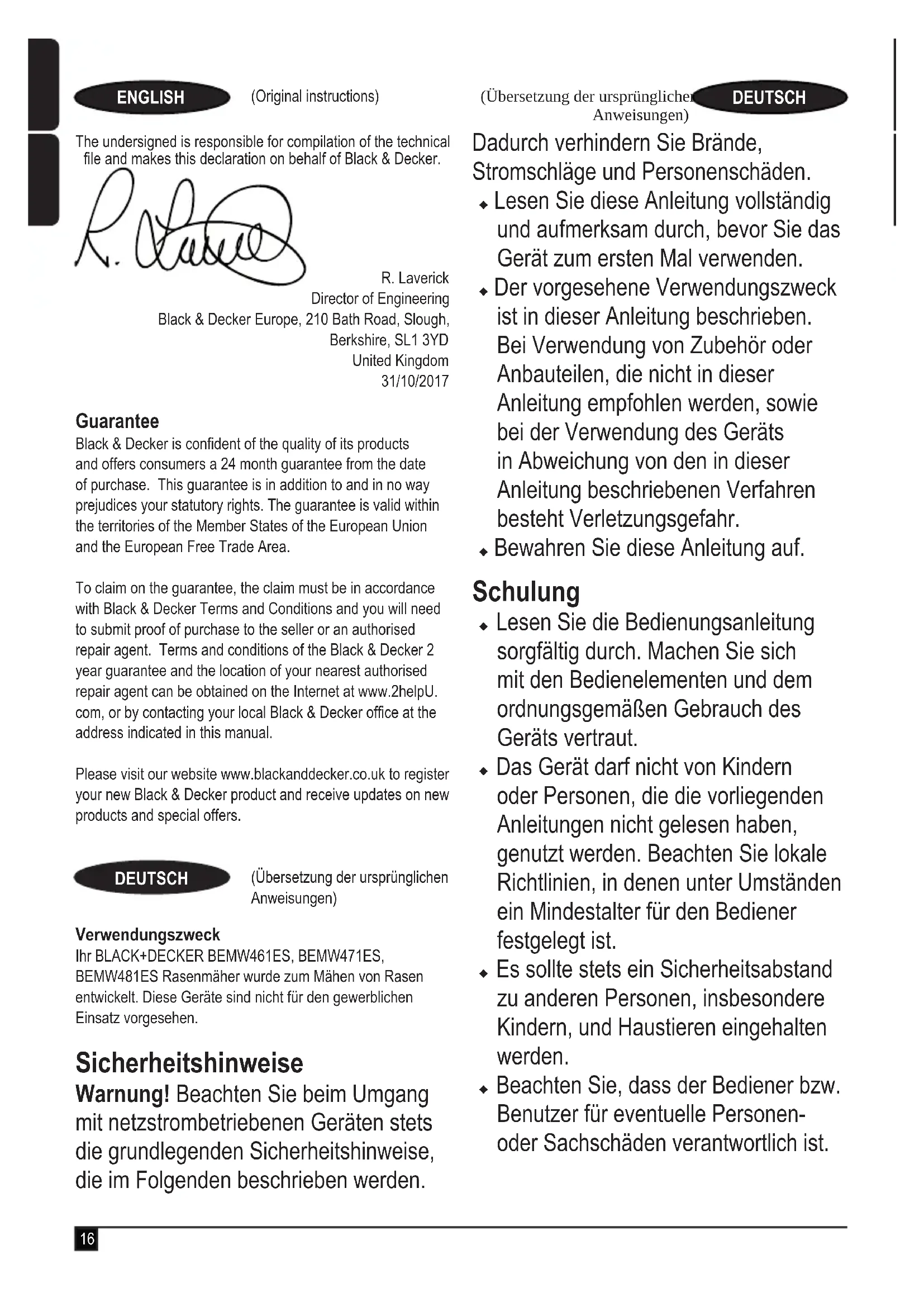 ENGLISH (Original instructions) (Übersetzung der ursprünglichen Anweisungen) DEUTSCH The undersigned is responsible for compilation of the technical le and makes this declaration on behalf of Black & Decker. R. Laverick Director of Engineering Black & Decker Europe, 210 Bath Road, Slough, Berkshire, SL1 3YD United Kingdom 31/10/2017 Guarantee Black & Decker is condent of the quality of its products and offers consumers a 24 month guarantee from the date of purchase. This guarantee is in addition to and in no way prejudices your statutory rights. The guarantee is valid within the territories of the Member States of the European Union and the European Free Trade Area. To claim on the guarantee, the claim must be in accordance with Black & Decker Terms and Conditions and you will need to submit proof of purchase to the seller or an authorised repair agent. Terms and conditions of the Black & Decker 2 year guarantee and the location of your nearest authorised repair agent can be obtained on the Internet at www.2helpU. com, or by contacting your local Black & Decker ofce at the address indicated in this manual. Please visit our website www.blackanddecker.co.uk to register your new Black & Decker product and receive updates on new products and special offers. Verwendungszweck Ihr BLACK+DECKER BEMW461ES, BEMW471ES, BEMW481ES Rasenmäher wurde zum Mähen von Rasen entwickelt. Diese Geräte sind nicht für den gewerblichen Einsatz vorgesehen. Sicherheitshinweise Warnung! Beachten Sie beim Umgang mit netzstrombetriebenen Geräten stets die grundlegenden Sicherheitshinweise, die im Folgenden beschrieben werden. Dadurch verhindern Sie Brände, Stromschläge und Personenschäden. u Lesen Sie diese Anleitung vollständig und aufmerksam durch, bevor Sie das Gerät zum ersten Mal verwenden. u Der vorgesehene Verwendungszweck ist in dieser Anleitung beschrieben. Bei Verwendung von Zubehör oder Anbauteilen, die nicht in dieser Anleitung empfohlen werden, sowie bei der Verwendung des Geräts in Abweichung von den in dieser Anleitung beschriebenen Verfahren besteht Verletzungsgefahr. u Bewahren Sie diese Anleitung auf. Schulung u Lesen Sie die Bedienungsanleitung sorgfältig durch. Machen Sie sich mit den Bedienelementen und dem ordnungsgemäßen Gebrauch des Geräts vertraut. u Das Gerät darf nicht von Kindern oder Personen, die die vorliegenden Anleitungen nicht gelesen haben, genutzt werden. Beachten Sie lokale Richtlinien, in denen unter Umständen ein Mindestalter für den Bediener festgelegt ist. u Es sollte stets ein Sicherheitsabstand zu anderen Personen, insbesondere Kindern, und Haustieren eingehalten werden. u Beachten Sie, dass der Bediener bzw. Benutzer für eventuelle Personen- oder Sachschäden verantwortlich ist.17 (Übersetzung der ursprünglichen Anweisungen) DEUTSCH Zubereitung u Tragen Sie stets feste Schuhe und eine lange Hose, wenn Sie mit dem Gerät arbeiten. Betreiben Sie dieses Gerät nie barfuß oder in offenen Sandalen. Tragen Sie keine lose Kleidung oder Kleidung mit herabhängenden Bändern. u Kontrollieren Sie stets den Bereich, in dem das Gerät verwendet werden soll, und entfernen Sie alle Gegenstände, die von dem Gerät umhergeschleudert werden können. u Überzeugen Sie sich vor der Verwendung, dass Mähmesser, Messerschraube und Mäheinheit weder abgenutzt noch beschädigt sind. Ersetzen Sie bei abgenutzten oder beschädigten Bestandteilen den entsprechenden Satz, sodass nicht neue und alte Komponenten gleichzeitig verwendet werden. Ersetzen Sie beschädigte oder unlesbare Aufkleber. u Prüfen Sie vor der Inbetriebnahme Netz- und Verlängerungskabel auf Beschädigungen und Verschleiß. Trennen Sie das Gerät sofort vom Stromnetz, wenn das Kabel während des Betriebs beschädigt wird. BERÜHREN SIE DAS KABEL NICHT,
