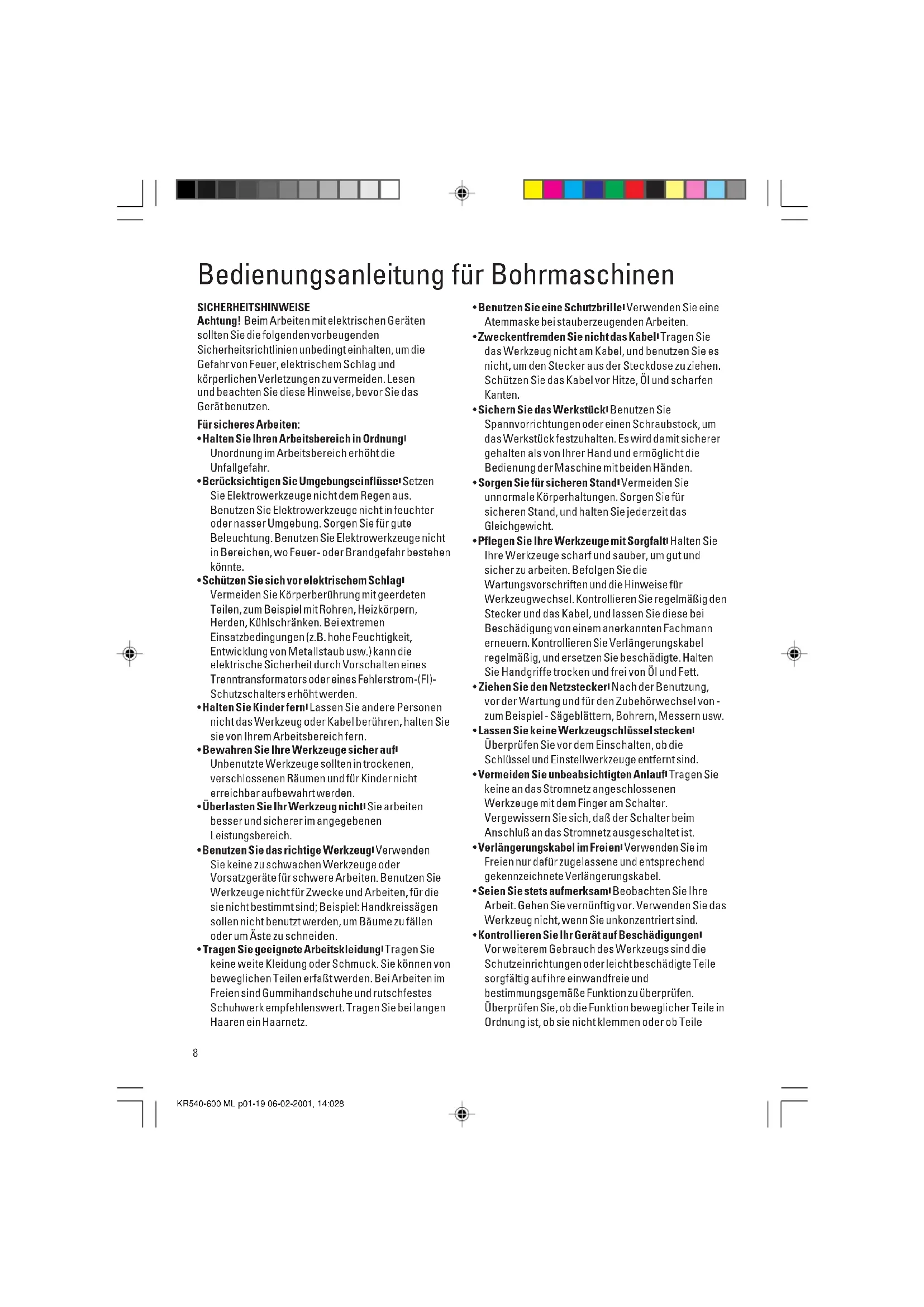 KR540-600 ML p01-19 06-02-2001, 14:021213 DEUTSCH Umschalters für Schlagbohren/Bohren, des Geschwindigkeitschalters oder Richtungsschalters niemals bei eingeschalteter Maschine um.