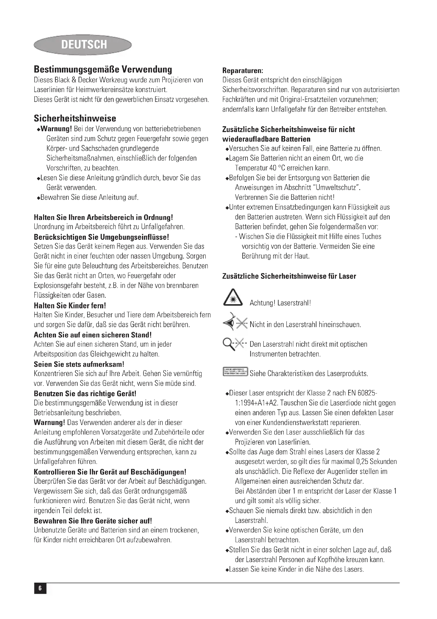 Kevin Hewitt Director of Consumer Engineering Spennymoor, County Durham DL16 6JG, United Kingdom 1-12-2004 Guarantee Black & Decker is confident of the quality of its products and offers an outstanding guarantee. This guarantee statement is in addition to and in no way prejudices your statutory rights. The guarantee is valid within the territories of the Member States of the European Union and the European Free Trade Area. If a Black & Decker product becomes defective due to faulty materials, workmanship or lack of conformity, within 24 months from the date of purchase, Black & Decker guarantees to replace defective parts, repair products subjected to fair wear and tear or replace such products to ensure minimum inconvenience to the customer unless: ◆ The product has been used for trade, professional or hire purposes; ◆ The product has been subjected to misuse or neglect; ◆ The product has sustained damage through foreign objects, substances or accidents; ◆ Repairs have been attempted by persons other than authorised repair agents or Black & Decker service staff. To claim on the guarantee, you will need to submit proof of purchase to the seller or an authorised repair agent. You can check the location of your nearest authorised repair agent by contacting your local Black & Decker office at the address indicated in this manual. Alternatively, a list of authorised Black & Decker repair agents and full details of our after-sales service and contacts are available on the Internet at: www.2helpU.com Please visit our website www.blackanddecker.co.uk to register your new Black & Decker product and to be kept up to date on new products and special offers. Further information on the Black & Decker brand and our range of products is available at www.blackanddecker.co.uk6 DEUTSCH Bestimmungsgemäße Verwendung Dieses Black & Decker Werkzeug wurde zum Projizieren von Laserlinien für Heimwerkereinsätze konstruiert. Dieses Gerät ist nicht für den gewerblichen Einsatz vorgesehen. Sicherheitshinweise ◆ Warnung! Bei der Verwendung von batteriebetriebenen Geräten sind zum Schutz gegen Feuergefahr sowie gegen Körper- und Sachschaden grundlegende Sicherheitsmaßnahmen, einschließlich der folgenden Vorschriften, zu beachten. ◆ Lesen Sie diese Anleitung gründlich durch, bevor Sie das Gerät verwenden. ◆ Bewahren Sie diese Anleitung auf. Halten Sie Ihren Arbeitsbereich in Ordnung! Unordnung im Arbeitsbereich führt zu Unfallgefahren. Berücksichtigen Sie Umgebungseinflüsse! Setzen Sie das Gerät keinem Regen aus. Verwenden Sie das Gerät nicht in einer feuchten oder nassen Umgebung. Sorgen Sie für eine gute Beleuchtung des Arbeitsbereiches. Benutzen Sie das Gerät nicht an Orten, wo Feuergefahr oder Explosionsgefahr besteht, z.B. in der Nähe von brennbaren Flüssigkeiten oder Gasen. Halten Sie Kinder fern! Halten Sie Kinder, Besucher und Tiere dem Arbeitsbereich fern und sorgen Sie dafür, daß sie das Gerät nicht berühren. Achten Sie auf einen sicheren Stand! Achten Sie auf einen sicheren Stand, um in jeder Arbeitsposition das Gleichgewicht zu halten. Seien Sie stets aufmerksam! Konzentrieren Sie sich auf Ihre Arbeit. Gehen Sie vernünftig vor. Verwenden Sie das Gerät nicht, wenn Sie müde sind. Benutzen Sie das richtige Gerät! Die bestimmungsgemäße Verwendung ist in dieser Betriebsanleitung beschrieben. Warnung! Das Verwenden anderer als der in dieser Anleitung empfohlenen Vorsatzgeräte und Zubehörteile oder die Ausführung von Arbeiten mit diesem Gerät, die nicht der bestimmungsgemäßen Verwendung entsprechen, kann zu Unfallgefahren führen. Kontrollieren Sie Ihr Gerät auf Beschädigungen! Überprüfen Sie das Gerät vor der Arbeit auf Beschädigungen. Vergewissern Sie sich, daß das Gerät ordnungsgemäß funktionieren wird. Benutzen Sie das Gerät nicht, wenn irgendein Teil defekt ist. Bewahren Sie Ihre Geräte sicher auf! Unbenutzte Geräte und Batterien sind an einem trockenen, für Kinder nicht erreichbaren Ort aufzubewahren. Reparaturen: Dieses Gerät entspricht den einschlägigen Sicherheitsvorschriften. Reparaturen sind nur von autorisierten Fachkräften und mit Original-Ersatzteilen vorzunehmen; andernfalls kann Unfallgefahr für den Betreiber entstehen. Zusätzliche Sicherheitshinweise für nicht wiederaufladbare Batterien ◆ Versuchen Sie auf keinen Fall, eine Batterie zu öffnen. ◆ Lagern Sie Batterien nicht an einem Ort, wo die Temperatur 40 °C erreichen kann. ◆ Befolgen Sie bei der Entsorgung von Batterien die Anweisungen im Abschnitt “Umweltschutz”. Verbrennen Sie die Batterien nicht! ◆ Unter extremen Einsatzbedingungen kann Flüssigkeit aus den Batterien austreten. Wenn sich Flüssigkeit auf den Batterien befindet, gehen Sie folgendermaßen vor: - Wischen Sie die Flüssigkeit mit Hilfe eines Tuches vorsichtig von der Batterie. Vermeiden Sie eine Berührung mit der Haut. Zusätzliche Sicherheitshinweise für Laser Achtung! Laserstrahl! Nicht in den Laserstrahl hineinschauen. Den Laserstrahl nicht direkt mit optischen Instrumenten betrachten. Siehe Charakteristiken des Laserprodukts. ◆ Dieser Laser entspricht der Klasse 2 nach EN 60825- 1:1994+A1+A2. Tauschen Sie die Laserdiode nicht gegen einen anderen Typ aus. Lassen Sie einen defekten Laser von einer Kundendienstwerkstatt reparieren. ◆ Verwenden Sie den Laser ausschließlich für das Projizieren von Laserlinien. ◆ Sollte das Auge dem Strahl eines Lasers der Klasse 2 ausgesetzt werden, so gilt dies für maximal 0,25 Sekunden als unschädlich. Die Reflexe der Augenlider stellen im Allgemeinen einen ausreichenden Schutz dar. Bei Abständen über 1 m entspricht der Laser der Klasse 1 und gilt somit als völlig sicher. ◆ Schauen Sie niemals direkt bzw. absichtlich in den Laserstrahl. ◆ Verwenden Sie keine optischen Geräte, um den Laserstrahl betrachten. ◆ Stellen Sie das Gerät nicht in einer solchen Lage auf, daß der Laserstrahl Personen auf Kopfhöhe kreuzen kann. ◆ Lassen Sie kei