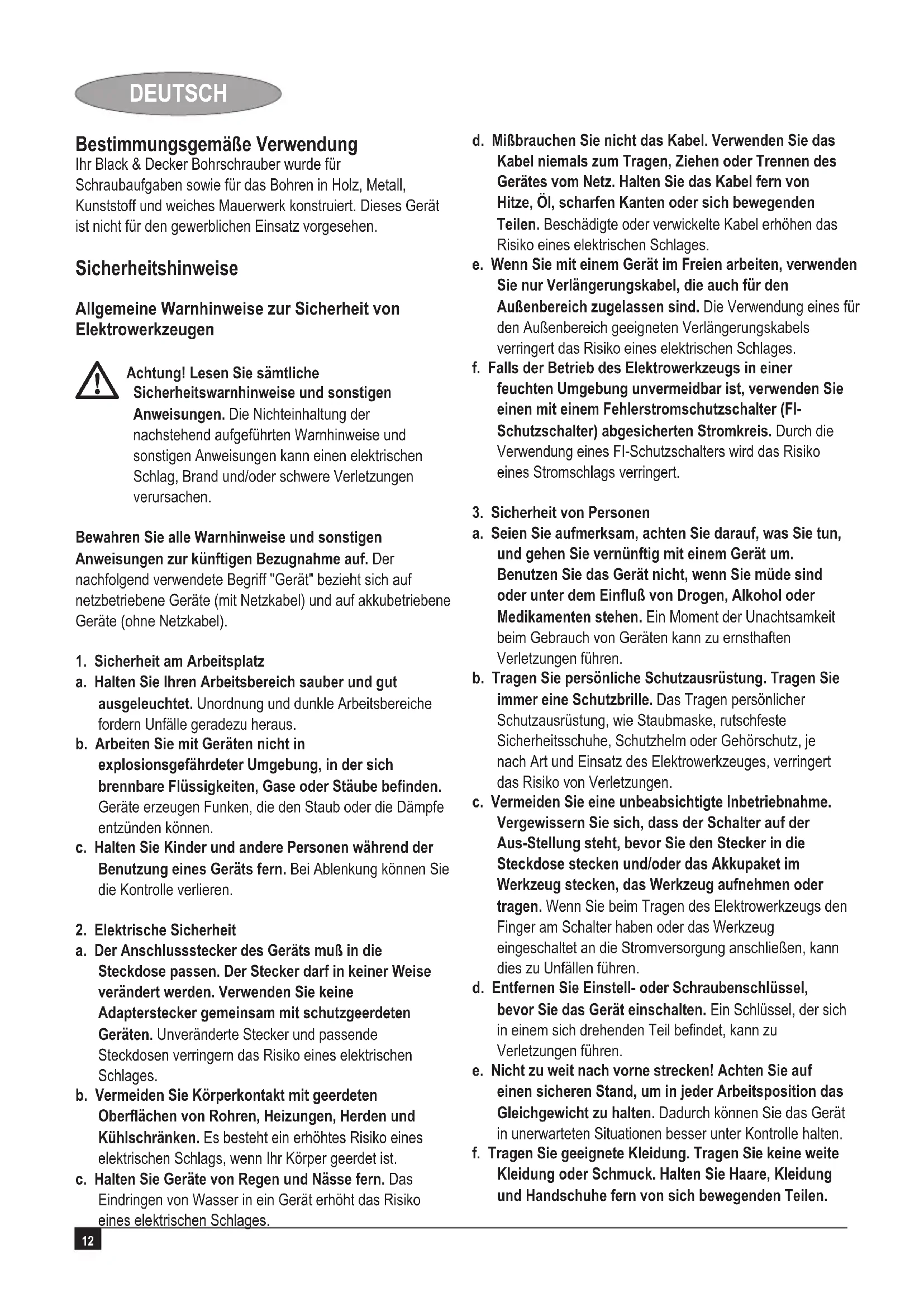 Kevin Hewitt Vice-President Global Engineering Black & Decker Europe, 210 Bath Road, Slough, Berkshire, SL1 3YD Vereinigtes Königreich 09/02/2010 Garantie Black & Decker vertraut auf die Qualität der eigenen Geräte und bietet dem Käufer eine außergewöhnliche Garantie. Diese Garantiezusage versteht sich unbeschadet der gesetzlichen Gewährleistungsansprüche und schränkt diese keinesfalls ein. Sie gilt in sämtlichen Mitgliedsstaaten der Europäischen Union und der Europäischen Freihandelszone EFTA. Tritt innerhalb von 24 Monaten ab Kaufdatum an einem Gerät von Black & Decker ein auf Material- oder Verarbeitungsfehler zurückzuführender Mangel auf, garantiert Black & Decker den Austausch defekter Teile, die Reparatur von Geräten mit üblichem Verschleiß bzw. den Austausch eines mangelhaften Geräts, ohne den Kunden dabei mehr als unbedingt nötig in Anspruch zu nehmen, allerdings vorbehaltlich folgender Ausnahmen: u wenn das Gerät gewerblich, beruich oder im Verleihgeschäft benutzt wurde; u wenn das Gerät mißbräuchlich verwendet oder mit mangelnder Sorgfalt behandelt wurde; u wenn das Gerät durch irgendwelche Fremdeinwirkung beschädigt wurde; u wenn ein unbefugter Reparaturversuch durch anderes Personal als das einer Vertragswerkstatt oder des Black & Decker-Kundendienstes unternommen wurde. Zur Inanspruchnahme dieser Garantie ist dem Verkäufer bzw. der Vertragswerkstatt ein Kaufnachweis vorzulegen. Der Kaufnachweis muß Kaufdatum und Gerätetyp bescheinigen. Die Adresse des zuständigen Büros von Black & Decker steht in dieser Anleitung, darüber läßt sich die nächstgelegene Vertragswerkstatt ermitteln. Außerdem ist eine Liste der Vertragswerkstätten und aller Kundendienststellen von Black & Decker sowie der zuständigen Ansprechpartner im Internet zu nden unter: www.2helpU.com Bitte besuchen Sie untere Webseite www.blackanddecker.de, um Ihr neues Black & Decker Produkt zu registrieren und über neue Produkte und Sonderangebote aktuell informiert zu werden. Weitere Informationen über die Marke Black & Decker und unsere Produkte nden Sie unter www.blackanddecker.de19 FRANÇAIS Utilisation prévue Votre perceuse / tournevis Black & Decker a été conçue pour la pose de vis et pour le perçage du bois, du métal, des matières plastiques et de la maçonnerie légère. Cet outil a été conçu pour une utilisation exclusivement domestique. Instructions de sécurité Consignes de sécurité générales pour les outils électriques