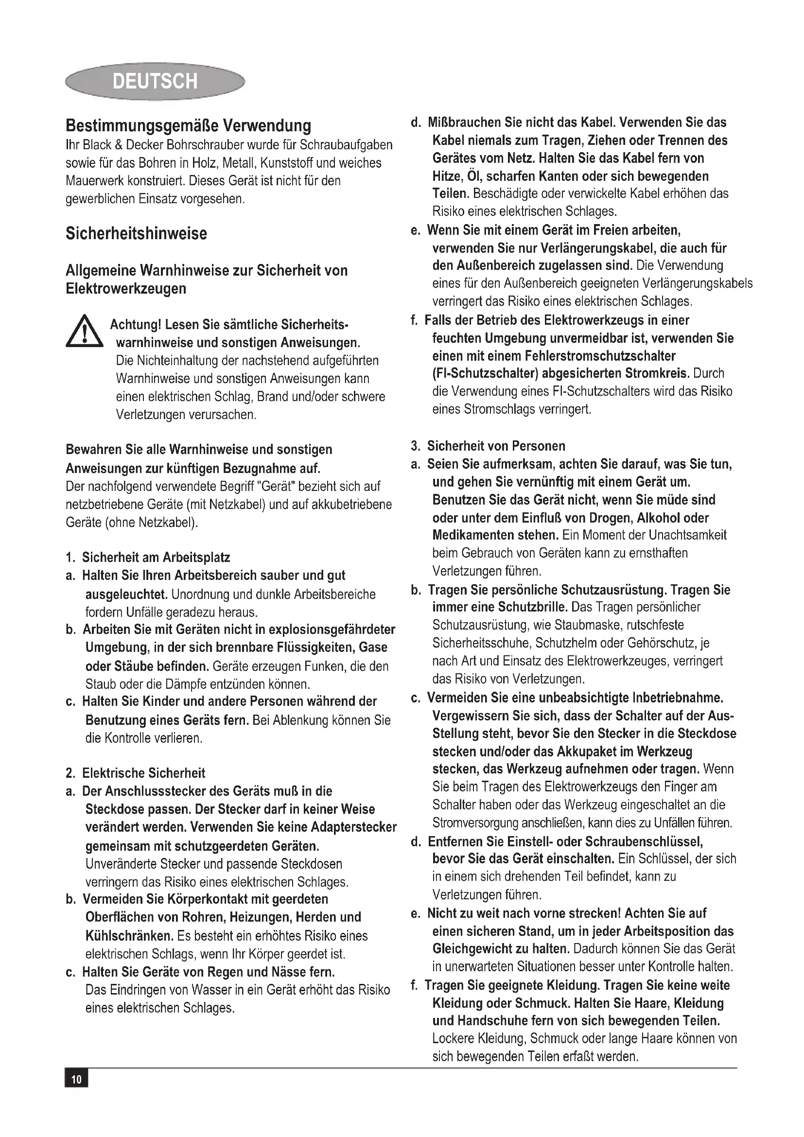 Kevin Hewitt Director of Consumer Engineering Spennymoor, County Durham DL16 6JG, Vereinigtes Königreich 02-6-200916 DEUTSCH Garantie Black & Decker vertraut auf die Qualität der eigenen Geräte und bietet dem Käufer eine außergewöhnliche Garantie. Diese Garantiezusage versteht sich unbeschadet der gesetzlichen Gewährleistungsansprüche und schränkt diese keinesfalls ein. Sie gilt in sämtlichen Mitgliedsstaaten der Europäischen Union und der Europäischen Freihandelszone EFTA. Tritt innerhalb von 24 Monaten ab Kaufdatum an einem Gerät von Black & Decker ein auf Material- oder Verarbeitungsfehler zurückzuführender Mangel auf, garantiert Black & Decker den Austausch defekter Teile, die Reparatur von Geräten mit üblichem Verschleiß bzw. den Austausch eines mangelhaften Geräts, ohne den Kunden dabei mehr als unbedingt nötig in Anspruch zu nehmen, allerdings vorbehaltlich folgender Ausnahmen: u wenn das Gerät gewerblich, beruich oder im Verleihgeschäft benutzt wurde; u wenn das Gerät mißbräuchlich verwendet oder mit mangelnder Sorgfalt behandelt wurde; u wenn das Gerät durch irgendwelche Fremdeinwirkung beschädigt wurde; u wenn ein unbefugter Reparaturversuch durch anderes Personal als das einer Vertragswerkstatt oder des Black & Decker-Kundendienstes unternommen wurde. Zur Inanspruchnahme dieser Garantie ist dem Verkäufer bzw. der Vertragswerkstatt ein Kaufnachweis vorzulegen. Der Kaufnachweis muß Kaufdatum und Gerätetyp bescheinigen. Die Adresse des zuständigen Büros von Black & Decker steht in dieser Anleitung, darüber läßt sich die nächstgelegene Vertragswerkstatt ermitteln. Außerdem ist eine Liste der Vertragswerkstätten und aller Kundendienststellen von Black & Decker sowie der zuständigen Ansprechpartner im Internet zu nden unter: www.2helpU.com Bitte besuchen Sie untere Webseite www.blackanddecker.de, um Ihr neues Black & Decker Produkt zu registrieren und über neue Produkte und Sonderangebote aktuell informiert zu werden. Weitere Informationen über die Marke Black & Decker und unsere Produkte nden Sie unter www.blackanddecker.de17 FRANÇAIS Utilisation prévue Votre perceuse / tournevis Black & Decker a été conçue pour la pose de vis et pour le perçage du bois, du métal, des matières plastiques et de la maçonnerie légère. Cet outil a été conçu pour une utilisation exclusivement domestique. Instructions de sécurité Consignes de sécurité générales pour les outils électriques