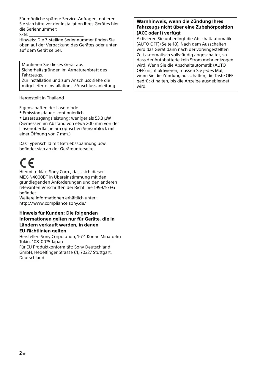 The character cannot be displayed. APP MENU (application menu) Button operation cannot be performed while a menu on iPhone/Android phone is open. Exit the menu on iPhone/Android phone. For BLUETOOTH function: BT BUSY (BLUETOOTH busy) The phonebook and the call history of the cellular phone are not accessible from this unit. Wait for a while, and then try again. APP NO DEV (application no device) The device with the application installed is not connected. Connect the device, then establish iPhone connection. ERROR BT Initialize failed. 25GB APP SOUND (application sound) Button operation cannot be performed while a sound menu on iPhone/Android phone is open. Exit the sound menu on iPhone/Android phone. OPEN APP (open application) The “App Remote” application is not running. Launch the iPhone’s application. If these solutions do not help improve the situation, consult your nearest Sony dealer. If you take the unit to be repaired because of CD playback trouble, bring the disc that was used at the time the problem began. 26GB Für mögliche spätere Service-Anfragen, notieren Sie sich bitte vor der Installation Ihres Gerätes hier die Seriennummer: S/N: ___________________________ Hinweis: Die 7-stellige Seriennummer finden Sie oben auf der Verpackung des Gerätes oder unten auf dem Gerät selber. Montieren Sie dieses Gerät aus Sicherheitsgründen im Armaturenbrett des Fahrzeugs. Zur Installation und zum Anschluss siehe die mitgelieferte Installations-/Anschlussanleitung. Hergestellt in Thailand Eigenschaften der Laserdiode Emissionsdauer: kontinuierlich Laserausgangsleistung: weniger als 53,3 μW (Gemessen im Abstand von etwa 200 mm von der Linsenoberfläche am optischen Sensorblock mit einer Öffnung von 7 mm.) Das Typenschild mit Betriebsspannung usw. befindet sich an der Geräteunterseite. Hiermit erklärt Sony Corp., dass sich dieser MEX-N4000BT in Übereinstimmung mit den grundlegenden Anforderungen und den anderen relevanten Vorschriften der Richtlinie 1999/5/EG befindet. Weitere Informationen erhältlich unter: http://www.compliance.sony.de/ Hinweis für Kunden: Die folgenden Informationen gelten nur für Geräte, die in Ländern verkauft werden, in denen EU-Richtlinien gelten Hersteller: Sony Corporation, 1-7-1 Konan Minato-ku Tokio, 108-0075 Japan Für EU Produktkonformität: Sony Deutschland GmbH, Hedelfinger Strasse 61, 70327 Stuttgart, Deutschland 2DE Warnhinweis, wenn die Zündung Ihres Fahrzeugs nicht über eine Zubehörposition (ACC oder I) verfügt Aktivieren Sie unbedingt die Abschaltautomatik (AUTO OFF) (Seite 18). Nach dem Ausschalten wird das Gerät dann nach der voreingestellten Zeit automatisch vollständig abgeschaltet, so dass der Autobatterie kein Strom mehr entzogen wird. Wenn Sie die Abschaltautomatik (AUTO OFF) nicht aktivieren, müssen Sie jedes Mal, wenn Sie die Zündung ausschalten, die Taste OFF gedrückt halten, bis die Anzeige ausgeblendet wird. Hinweise zur BLUETOOTH-Funktion Achtung UNTER KEINEN UMSTÄNDEN ÜBERNIMMT SONY DIE