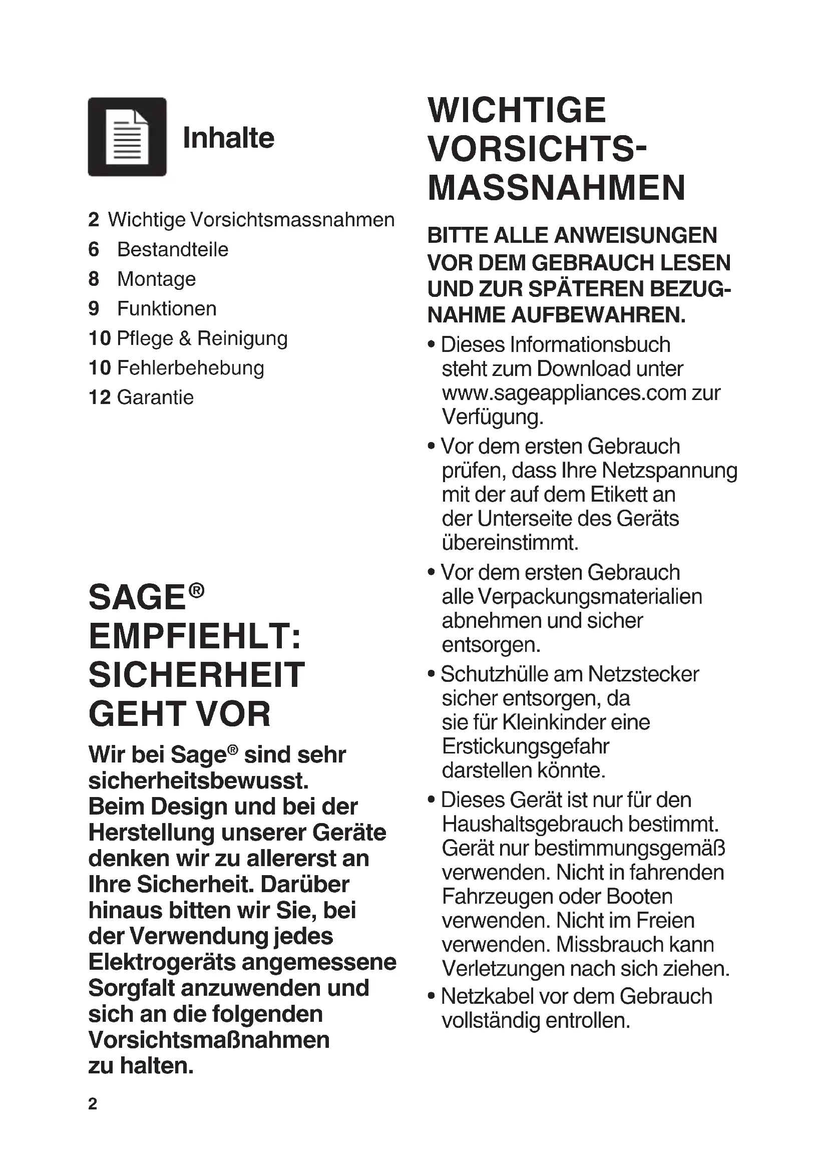 - Dieses Informationsbuch steht zum Download unter www.sageappliances.com zur Verfügung.