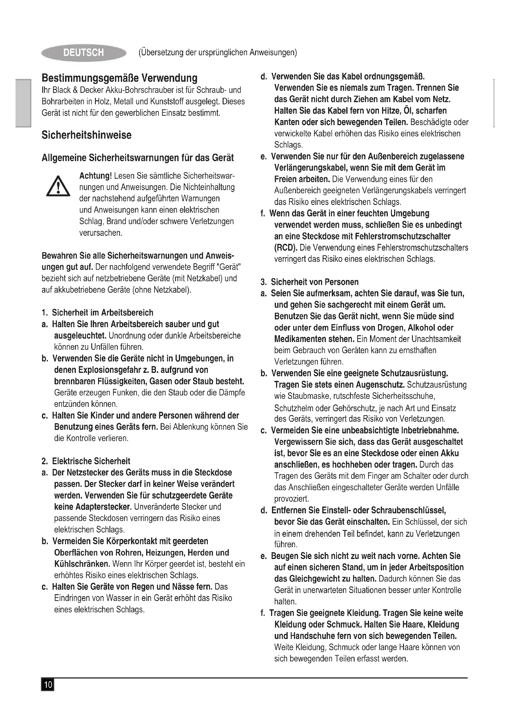 Kevin Hewitt Vice-President Global Engineering Black & Decker Europe, 210 Bath Road, Slough, Berkshire, SL1 3YD Großbritannien 16/11/201017 (Übersetzung der ursprünglichen Anweisungen) DEUTSCH Garantie Black & Decker vertraut auf die Qualität der eigenen Geräte und bietet dem Käufer eine außergewöhnliche Garantie. Diese Garantiezusage versteht sich unbeschadet der gesetzlichen Gewährleistungsansprüche und schränkt diese keinesfalls ein. Sie gilt in sämtlichen Mitgliedstaaten der Europäischen Union und der Europäischen Freihandelszone EFTA. Tritt innerhalb von 24 Monaten ab Kaufdatum an einem Gerät von Black & Decker ein auf Material- oder Verarbeitungsfehler zurückzuführender Mangel auf, garantiert Black & Decker den Austausch defekter Teile, die Reparatur von Geräten mit üblichem Verschleiß bzw. den Austausch eines mangelhaften Gerätes, ohne den Kunden dabei mehr als unbedingt nötig in Anspruch zu nehmen, allerdings vorbehaltlich folgender Ausnahmen: u wenn das Gerät gewerblich, beruich oder im Verleihge- schäft benutzt wurde; u wenn das Gerät missbräuchlich verwendet oder mit mangelnder Sorgfalt behandelt wurde; u wenn das Gerät durch irgendwelche Fremdeinwirkung beschädigt wurde; u wenn ein unbefugter Reparaturversuch durch anderes Personal als das einer Vertragswerkstatt oder des Black & Decker Kundendiensts unternommen wurde. Zur Inanspruchnahme dieser Garantie ist dem Verkäufer bzw. der Vertragswerkstatt ein Kaufnachweis vorzulegen. Die Adresse der zuständigen Niederlassung von Black & Decker steht in dieser Anleitung. Dort teilt man Ihnen gerne die näch- stgelegene Vertragswerkstatt mit. Eine Liste der Vertragswerk- stätten und aller Kundendienststellen von Black & Decker sowie der zuständigen Ansprechpartner nden Sie auch im Internet unter: www.2helpU.com Bitte besuchen Sie unsere Website www.blackanddecker. de, um Ihr neues Black & Decker Produkt zu registrieren. Dort erhalten Sie auch Informationen über neue Produkte und Sonderangebote. Weitere Informationen über die Marke Black & Decker und unsere Produkte nden Sie unter www. blackanddecker.de.18 (Traduction des instructions initiales) FRANÇAIS Utilisation Votre perceuse/visseuse Black & Decker peut visser et percer le bois, le métal et le plastique. Cet outil est destiné à une utilisation exclusivement domestique. Consignes de sécurité Consignes de sécurité concernant les outils élec- troportatifs