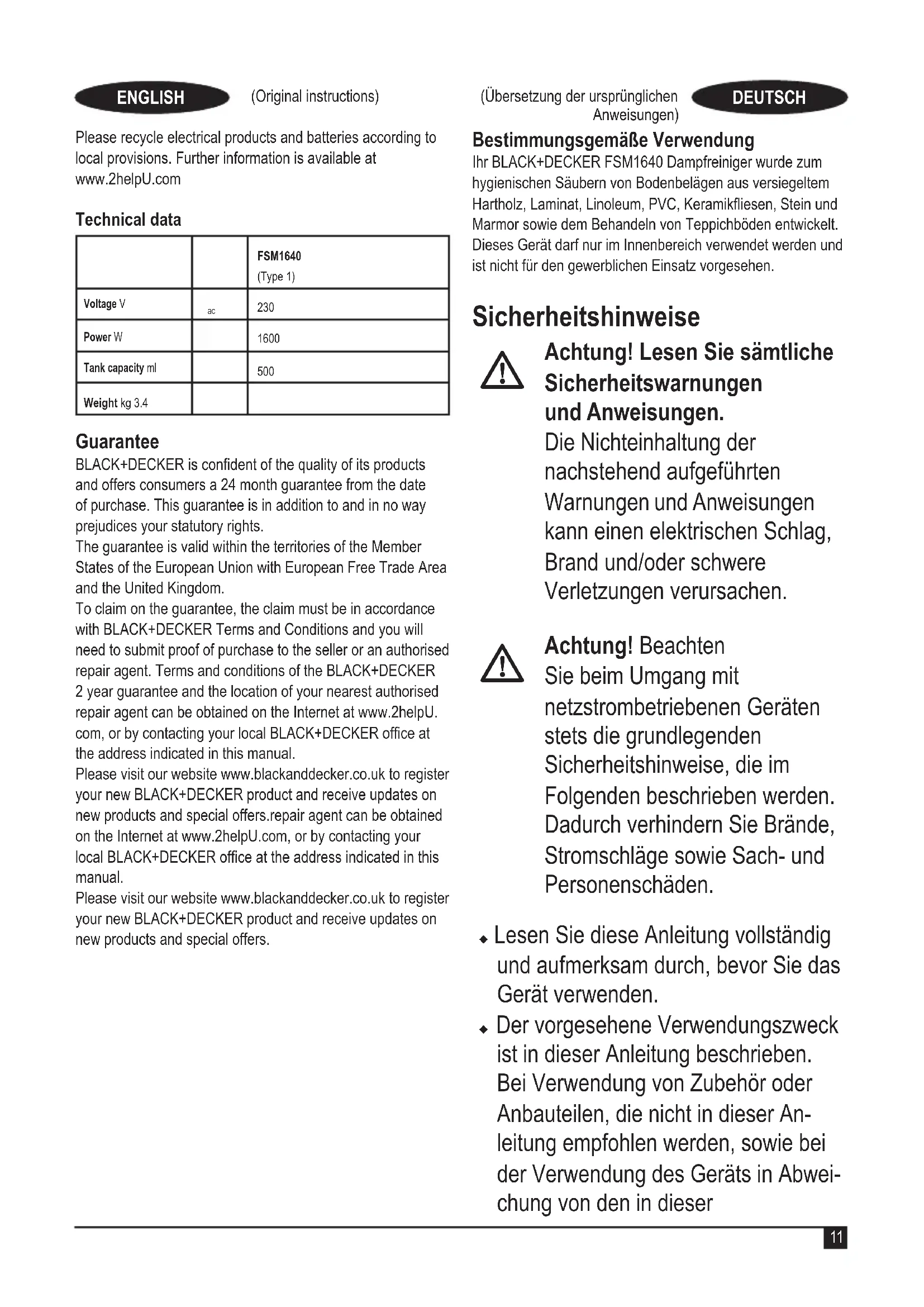 Gewicht kg 3.4 Garantie Black & Decker vertraut auf die Qualität der eigenen Geräte und bietet dem Käufer eine außergewöhnliche Garantie von 24 Monaten ab Kaufdatum. Diese Garantie versteht sich unbeschadet der gesetzlichen Gewährleistungsansprüche und schränkt diese keinesfalls ein. Diese Garantie gilt innerhalb der Staatsgebiete der Mitglied- staaten der Europäischen Union mit der Europäischen Frei- handelszone und innerhalb des Vereinigten Königreichs. Zur Inanspruchnahme dieser Garantie muss sie den allgemei- nen Geschäftsbedingungen von Black & Decker entsprechen und dem Verkäufer bzw. der Vertragswerkstatt ist ein Kauf- nachweis vorzulegen. Die Bedingungen für die 2-jährige Garantie von Black & De- cker und den Standort Ihrer nächstgelegenen Vertragswerk- statt nden Sie im Internet unter www.2helpU.com oder indem Sie sich an die lokale Black & Decker-Niederlassung wenden, deren Adresse Sie in dieser Anleitung nden.19 (Übersetzung der ursprünglichen Anweisungen) DEUTSCH (Traduction des instructions initiales) FRANÇAIS (Traduction des instructions initiales) FRANÇAIS Die Bedingungen für die 2-jährige Garantie von Black & De-cker und den Standort Ihrer nächstgelegenen Vertragswerk-statt nden Sie im Internet unter www.2helpU.com oder indem Sie sich an die lokale Black & Decker-Niederlassung wenden, deren Adresse Sie in dieser Anleitung nden. Utilisation Votre balai vapeur BLACK+DECKER FSM1640 a été conçu pour désinfecter et nettoyer les planchers vernis, les sols en bois lamellés vernis, en lino, en vinyle, en carrelage, en pierre et en marbre. Il convient également au rafraîchissement des moquettes. Il est destiné à une utilisation à l’intérieur et exclusivement domestique. Consignes de sécurité