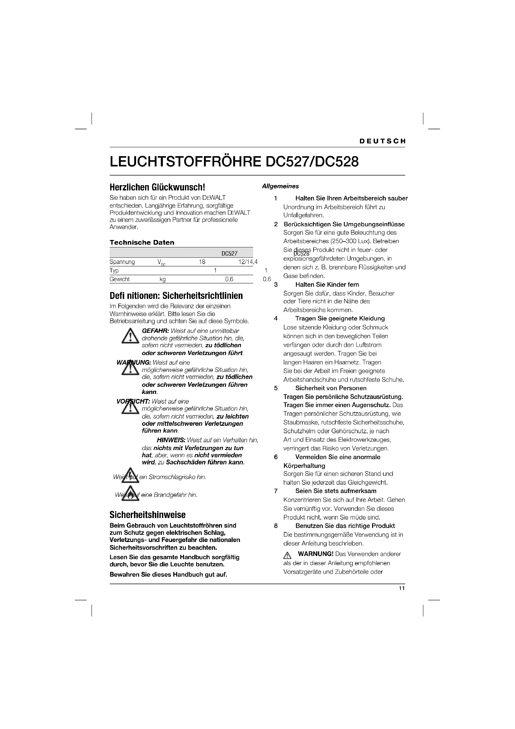 18 12/14,4 Typ 1 1 Gewicht kg 0,6 0,6 Defi nitionen: Sicherheitsrichtlinien Im Folgenden wird die Relevanz der einzelnen Warnhinweise erklärt. Bitte lesen Sie die Betriebsanleitung und achten Sie auf diese Symbole. GEFAHR: Weist auf eine unmittelbar drohende gefährliche Situation hin, die, sofern nicht vermieden, zu tödlichen oder schweren Verletzungen führt. WARNUNG: Weist auf eine möglicherweise gefährliche Situation hin, die, sofern nicht vermieden, zu tödlichen oder schweren Verletzungen führen kann. VORSICHT: Weist auf eine möglicherweise gefährliche Situation hin, die, sofern nicht vermieden, zu leichten oder mittelschweren Verletzungen führen kann. HINWEIS: Weist auf ein Verhalten hin, das nichts mit Verletzungen zu tun hat, aber, wenn es nicht vermieden wird, zu Sachschäden führen kann. Weist auf ein Stromschlagrisiko hin. Weist auf eine Brandgefahr hin. Sicherheitshinweise Beim Gebrauch von Leuchtstoffröhren sind zum Schutz gegen elektrischen Schlag, Verletzungs- und Feuergefahr die nationalen Sicherheitsvorschriften zu beachten. Lesen Sie das gesamte Handbuch sorgfältig durch, bevor Sie die Leuchte benutzen. Bewahren Sie dieses Handbuch gut auf. Allgemeines 1 Halten Sie Ihren Arbeitsbereich sauber Unordnung im Arbeitsbereich führt zu Unfallgefahren. 2 Berücksichtigen Sie Umgebungseinfl üsse Sorgen Sie für eine gute Beleuchtung des Arbeitsbereiches (250–300 Lux). Betreiben Sie dieses Produkt nicht in feuer- oder explosionsgefährdeten Umgebungen, in denen sich z. B. brennbare Flüssigkeiten und Gase befi nden. 3 Halten Sie Kinder fern Sorgen Sie dafür, dass Kinder, Besucher oder Tiere nicht in die Nähe des Arbeitsbereichs kommen. 4 Tragen Sie geeignete Kleidung Lose sitzende Kleidung oder Schmuck können sich in den beweglichen Teilen verfangen oder durch den Luftstrom angesaugt werden. Tragen Sie bei langen Haaren ein Haarnetz. Tragen Sie bei der Arbeit im Freien geeignete Arbeitshandschuhe und rutschfeste Schuhe. 5 Sicherheit von Personen Tragen Sie persönliche Schutzausrüstung. Tragen Sie immer einen Augenschutz. Das Tragen persönlicher Schutzausrüstung, wie Staubmaske, rutschfeste Sicherheitsschuhe, Schutzhelm oder Gehörschutz, je nach Art und Einsatz des Elektrowerkzeuges, verringert das Risiko von Verletzungen. 6 Vermeiden Sie eine anormale Körperhaltung Sorgen Sie für einen sicheren Stand und halten Sie jederzeit das Gleichgewicht. 7 Seien Sie stets aufmerksam Konzentrieren Sie sich auf Ihre Arbeit. Gehen Sie vernünftig vor. Verwenden Sie dieses Produkt nicht, wenn Sie müde sind. 8 Benutzen Sie das richtige Produkt Die bestimmungsgemäße Verwendung ist in dieser Anleitung beschrieben. WARNUNG! Das Verwenden anderer als der in dieser Anleitung empfohlenen Vorsatzgeräte und Zubehörteile oder12 die Ausführung von Arbeiten, die nicht der bestimmungsgemäßen Verwendung entsprechen, kann zu Unfallgefahren führen. 9 Kontrollieren Sie das Produkt auf Beschädigungen Überprüfen Sie das Produkt vor der Verwendung sorgfältig. Prüfen Sie, ob Teile gebrochen, Schutzvorrichtungen und Schalter beschädigt oder in einem Zustand sind, der den Betrieb beeinträchtigen kann. Achten Sie darauf, dass das Produkt korrekt läuft und seine bestimmungsgemäße Funktion ausführbar ist. Verwenden Sie das Gerät nicht, wenn irgendein Teil beschädigt ist. Benutzen Sie das Produkt nicht, wenn der Schalter defekt ist. Beschädigte Schalter müssen durch eine autorisierte D EWALT Kundendienstwerkstatt ersetzt werden. Führen Sie Reparaturen niemals selbst durch. 10 Entfernen Sie den Akku Entfernen Sie den Akku, wenn Sie das Produkt nicht benutzen, bevor Sie irgendwelche Produktteile oder Zubehörteile auswechseln und bevor Sie irgendwelche Wartungsarbeiten vornehmen. 11 Aufbewahrung Wenn das Produkt nicht verwendet wird, muss es in trockenen, verschlossenen Räumen und für Kinder nicht erreichbar aufbewahrt werden. 12 Pfl egen Sie das Produkt mit Sorgfalt Halten Sie das Produkt in gutem Zustand, um gut und sicher arbeiten zu können. Befolgen Sie die Wartungsvorschriften und die Hinweise für den Zubehörwechsel. Halten Sie alle Griffe und Schalter trocken, sauber und frei von Öl und Fett. 13 Reparaturen Dieses Produkt entspricht den geltenden Sicherheitsbestimmungen. Lassen Sie das Produkt von einer autorisierten
